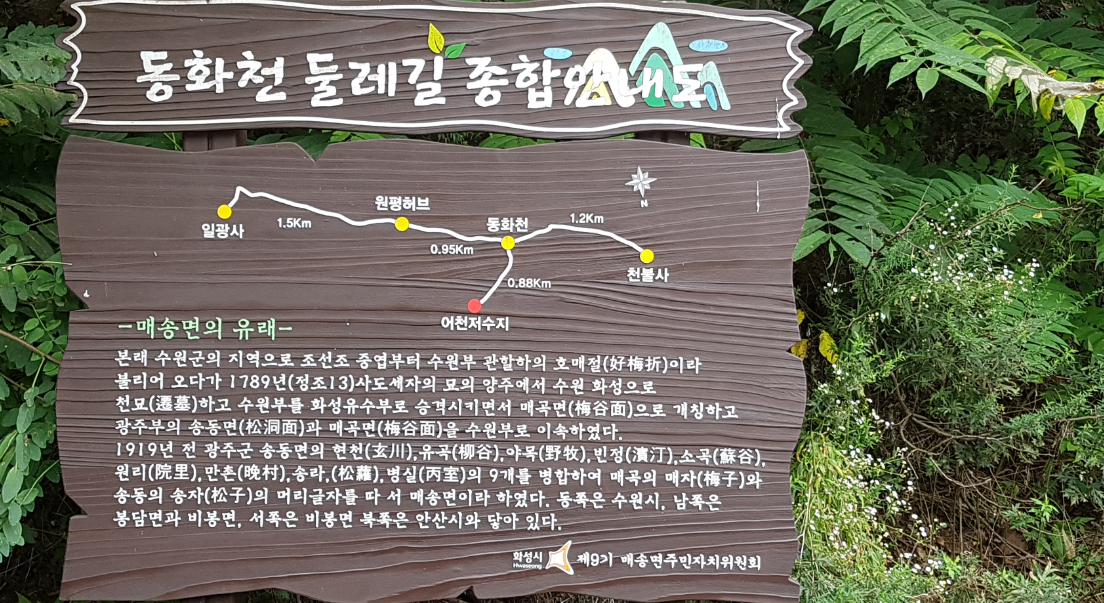 경기도 화성시 매송면 어천리에서 발원하여 어천저수지를 지나 남쪽으로 흘러서 동화천으로 합류하는 지방하천입니다. 한강 서해 수계의 지방하천으로 동화천의 제1지류인데, 1956년에 저수되어 75,00여평 수면적을 자랑하는 어천저수지는 현재 가족낚시터로 이용되고 있으나, 4271㎡ 규모의 메인광장·야영장·캠핑장·글램핑장과 부대시설을 설치할 예정입니다. 저수지를 한바퀴 걸어서 돌아드는 시간은 약 40분정도 소요 됩니다.