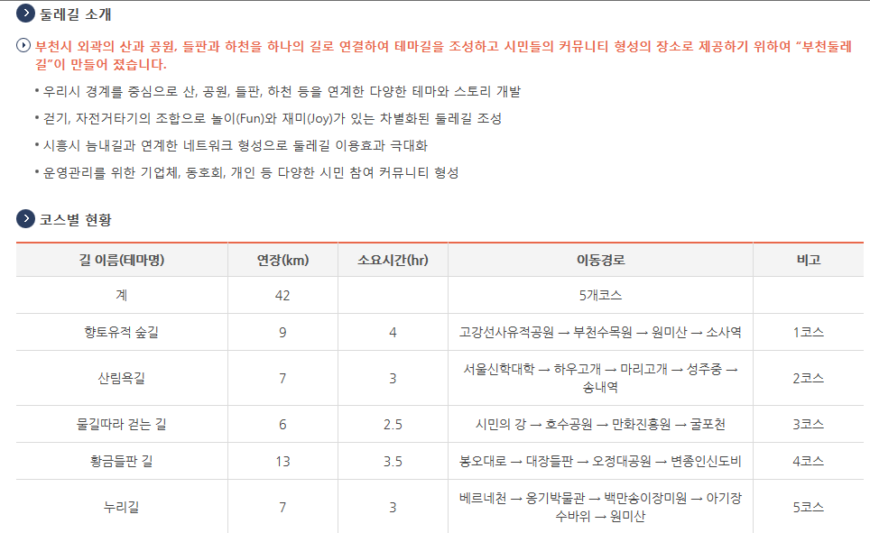 2010년 5월 25일 부천시에서 주관하여 기존의 원미산 등산로를 활용한 올레길과 둘레길의 조성했다. 가톨릭대학교 부천성모병원 후문인 소사주민센터 앞에서 시작해 원미산 능선을 따라 오르는 4㎞의 올레길이 생겨났고, 원미산 산자락을 돌아 도는 3㎞의 둘레길에는 ‘이야기가 있는 숲길’을 주제로 걷고 싶은 트레킹코스와 자연생태 학습의 두 가지 주제로 만들어졌다.