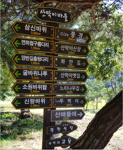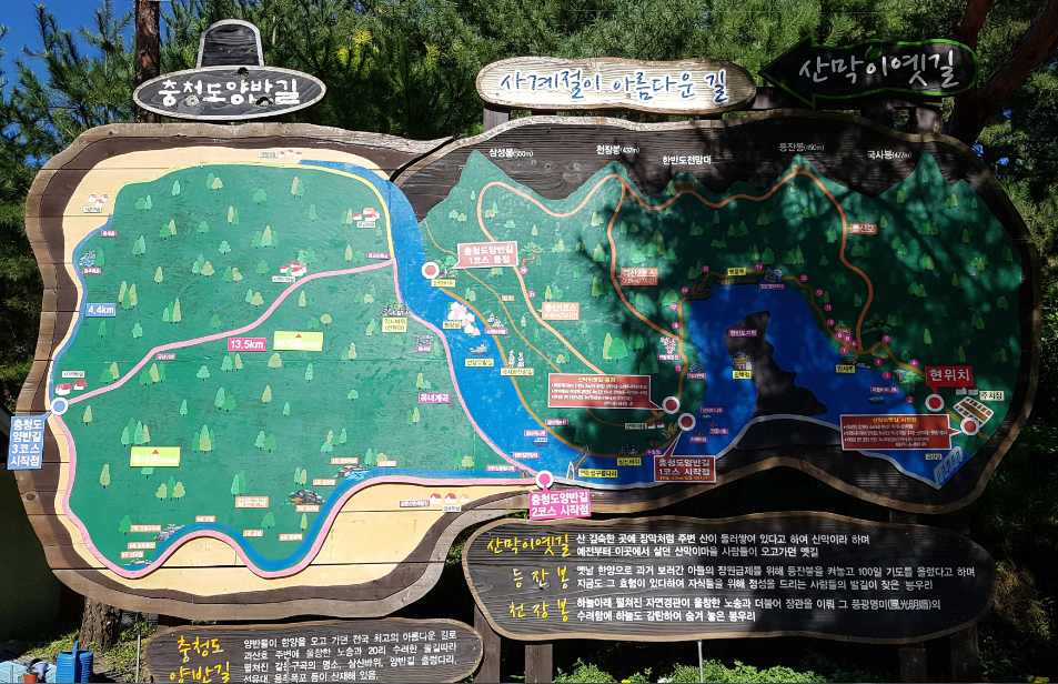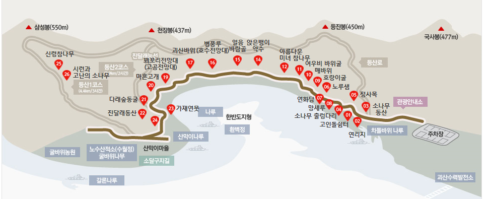 1코스 4.4km(노루샘부터 산막이마을): 고인돌쉼터, 연리지, 소나무동산, 소나무출렁다리, 정사목, 노루샘, 연화담, 망세루, 호랑이굴,매바위,여우비 바위굴, 아름다운미녀참나무, 앉은뱅이약수, 얼음바람골,병풍루,괴산바위,꾀꼬리전망대, 마흔고개, 다래숲동굴,진달래동산,가재연못,신령참나무,시련과고난의소나무.