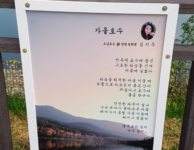 오남호수 詩정원에 전시된 시와 그림들. 긴 제방에 시와 그림들이 즐비하게 전시되어 있다. 이 아름다운 글과 오색찬연한 그림들을 보면서 오남저수지 둘레길 풍경과 물빛을 유유자적 음미하노라면, 시인이 아닌 그 누구라도 저절로 시인이 될 수 있을거 같다는 생각을 하게 된다.