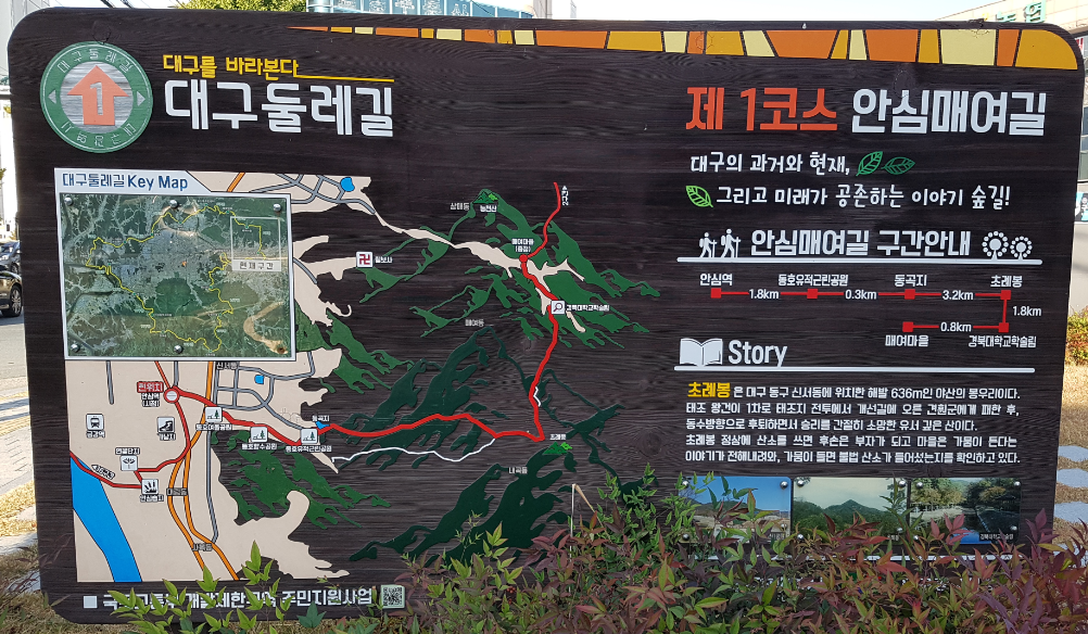 안심역 1번출구로 나오면 대구둘레길 제1코스인 안심매여길이 시작된다. 안심매여길은 대구 둘레길의 제1구간이다. 주요 코스로는 안심역 → 동호유적근린공원 → 동곡지 → 초례봉 → 경북대학교 학술림 → 매여마을이다. 코스의 시작지점인 안심역과 끝지점인 매여마을에 도시철도와 버스정류장이 있어 대중교통을 편리하게 이용할 수 있다. 이 코스는 소나무 숲이 잘 정비되어 있어, 솔숲을 감상하면서 걷기에 좋은 길이다. 그리고 초례봉에서 바라보는 경관이 특히 아름답다.