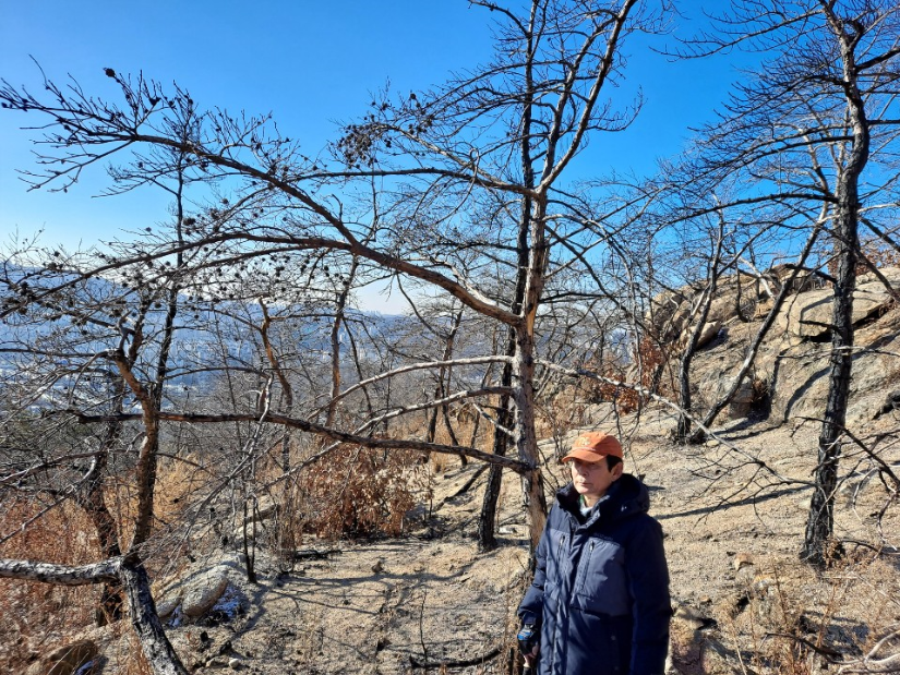 검게 불타버린 나무들 숲에서 우리들이 자연을 보호해야 할 막중한 책임감을 느끼며 사진으로 남겼다. 바위들 사이에서 어렵고 힘든 삶을 버텨왔을 나무들이 일순간에 이렇게 검은 잿더미로 변해버린 무상함....