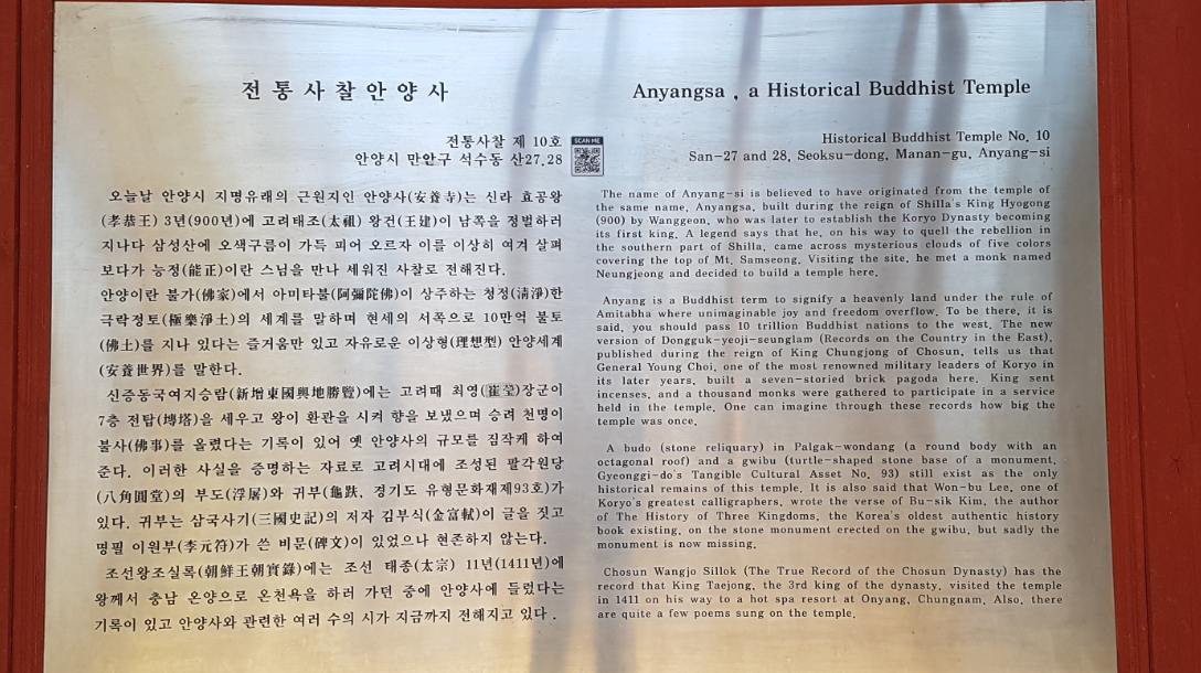 안양사는 경기도 안양시에 위치하고 있으며 태고종에 소속되어 있는 사찰이다. 삼성산을 주산으로 자리 잡고 있는 사찰이다. 삼성산은 관악산에서 갈라져 나온 봉우리로 관악산과 연계된 등산로는 수도권에서 으뜸일 정도로 유명하며, 주말이면 수많은 관광객들로 발 디딜 틈이 없을 정도라하는데 요즘은 코로나19로 인적이 끊겼다.