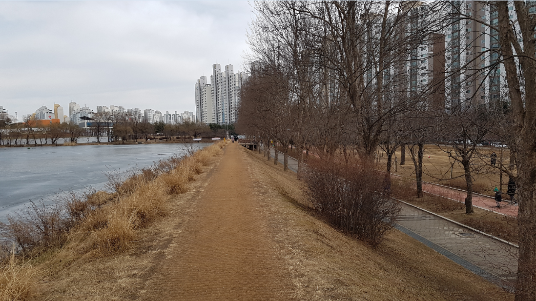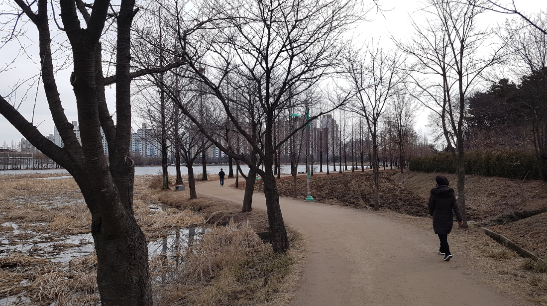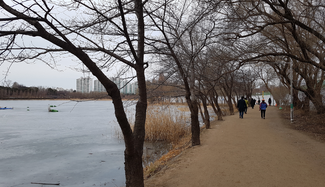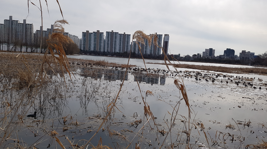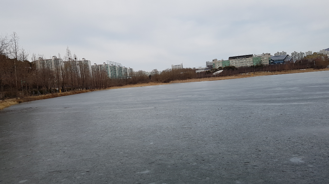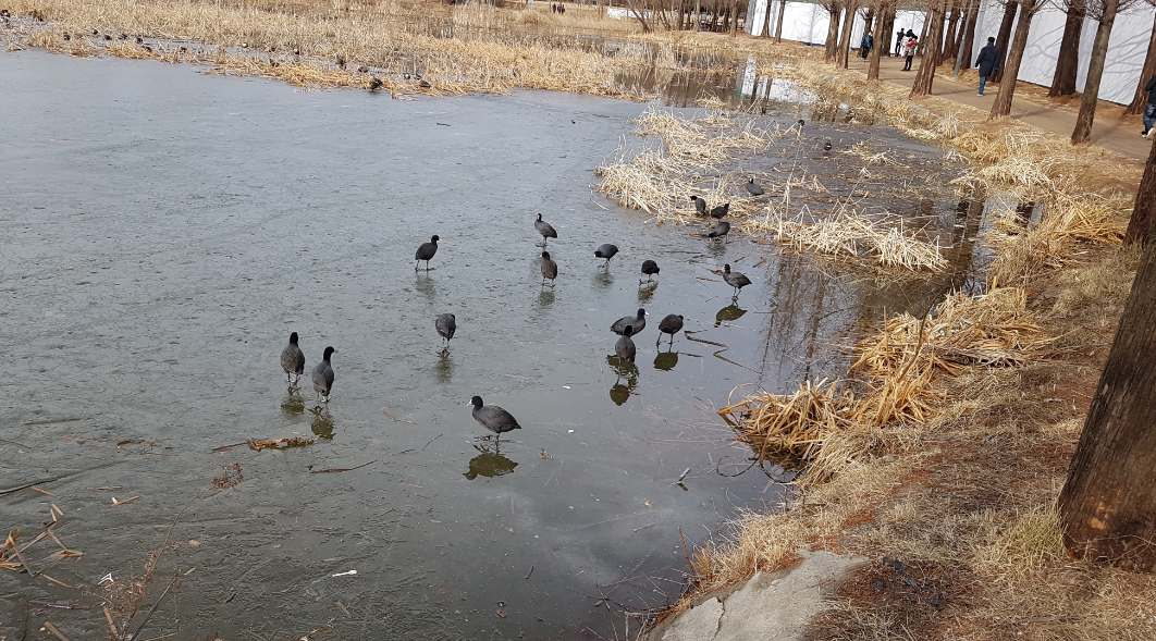 겨울이라서 꽁꽁 얼어버린 얼음위에 한가로이 노니는 오리처럼 생긴 이름모를 새떼들이, 우리 어린시절에 시골마을에서 눈썰매와 팽이치기로 얼음판위에서 동네친구들과 무리지어 놀던 그때 그 시절을 떠오르게 하여 너무나도 정겹다.