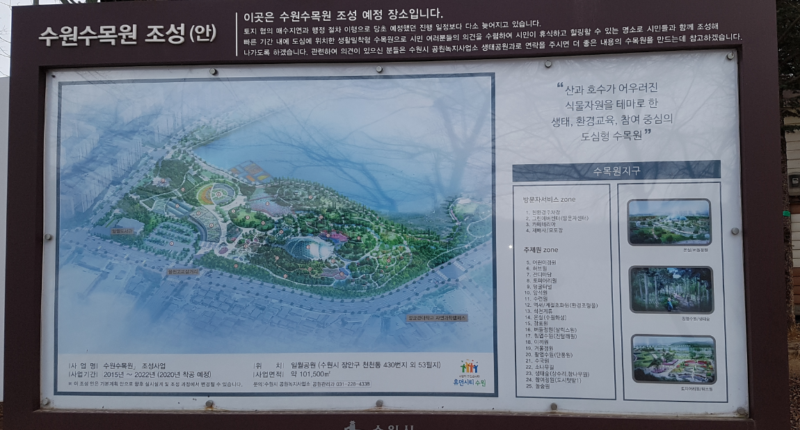 생태정원에는 ▲수원시 숲의 생태를 보전하는 숲 정원 ▲습지의 아름다움을 보여주는 습지원 ▲건조기후 지역의 식물을 전시해 기후변화에 따른 숲의 모습을 보여주는 건조 정원 ▲초지(草地)의 예술적 가치를 보여주는 초지원 등이 조성된단다. 웰컴 정원에는 ▲한겨울에도 찾을 수 있는 겨울정원 ▲예술적으로 조성한 장식 정원 ▲식용·약용 식물을 볼 수 있는 맛있는 정원 ▲빗물 재활용과 물순환 과정을 볼 수 있는 빗물정원 등이 조성되는 공사가 진행 중이다.