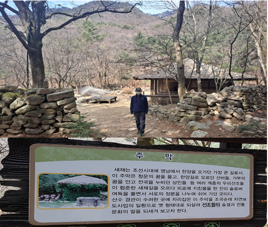 왼편으로 ‘주막’ 표지판이 의젓하게 걸려 있는 집 한 채를 만나게 된다. 하지만 아픈 다리도 쉬어갈 겸, 마른 목도 축일 겸, 새재 넘는 기분도 살릴 겸 기대를 갖고 들어서면 안된다. 이 집은 새재를 넘기 전에 이쯤에서 쉬어갔다는 옛이야기에 따라 어림으로 건물만 덜렁 지어놓았을 뿐이지 술이나 안주를 팔기는커녕 지키는 사람조차 없다.
