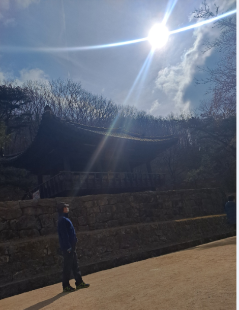 소원성취탑을 지나면서 돌하나를 집어올려 놓았을 뿐인데, 교구정터 앞에서 태양이 내 앞길을 화안하게 비추이고 있어서 사진으로 남겼단다. 참으로 경이로운 일이다. 내게 무슨 소원이 있겠는가? 지금까지의 삶에 감사하면서 전생에 노비였을 것이니 앞으로 남은 인생에서도 더 낮은 자세로 비움, 나눔과 봉사로 살아가게 해 달라는 바람을 마음속에 빌었을 뿐이다. 아마도 그 소원이 이루어 질 거 같다.