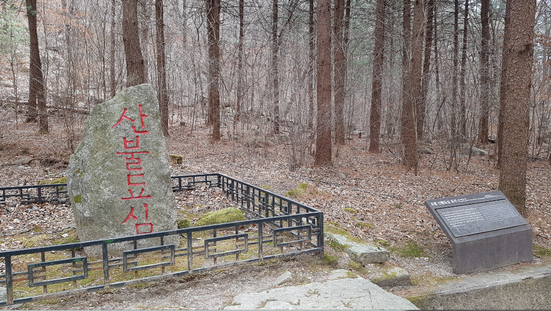 교구정터를 지나 올라가면 비뚤어지면 비뚤어진 대로 자연석을 그대로 사용한 비석 하나가 눈에 들어온다. 비석에는 고졸한 필치로 ‘산불됴심’이라고 새겨져 있다. 조선 후기에 세워졌으리라고 여겨지는 이 비석은 처음 세워진 때부터 여지껏 제자리를 지키고 있었던 듯하다. 요즈음에도 흔한 표어 ‘산불조심’ 자체가 낯익기도 하지만, 한글로 새겨져 있어 더욱 이채롭다. 이를 귀히 여겨 경상북도 문화재자료 제226호로 지정했다. 현존하는 유일한 순 한글비석이며, 18세기 당시 산불에 대한 경각심을 일깨워주는 문구이면서 구개음화가 활발해진 시대상을 반영하여 역사적 가치가 높다.