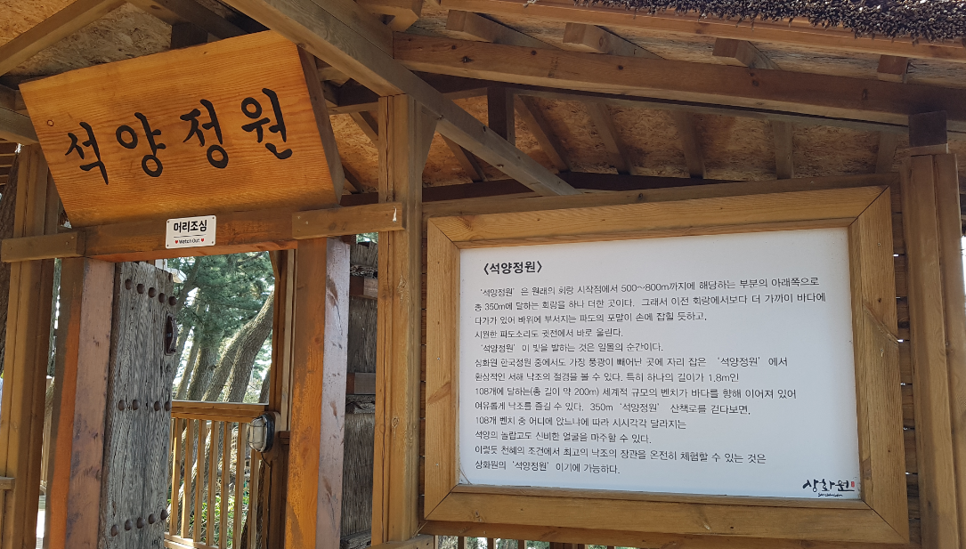 석양정원은 해변독서실 주변의 기존 회랑 아래쪽으로 총 350m에 달하는 회랑을 하나 더한 곳으로, 보다 더 가까이 바다에 다가가 있어 바위에 부서지는 파도의 포말이 손에 잡힐 듯하고, 시원한 파도소리를 함께할 수 있다. 그리고, 총 길이가 200m에 달하는 세계적 규모의 나무벤치가 바다를 향해 이어져 있어 여유로운 산책과 낙조를 즐길 수 있다. 상화원에서 가장 풍광이 빼어난 곳에 자리 잡은 석양정원에서는 누구나 포토그래퍼가 되는 곳으로 환상적인 서해 낙조의 절경을 감상할 수 있다.
