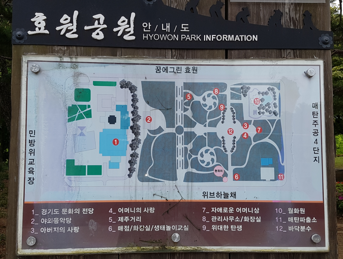 효원(孝圓)공원은 효를 상징하는 각종 기념물을 세워 조성한 공원이다. 입구에서부터 수원의 상징인 화성을 모형처럼 만든 성곽의 모습이 영화 촬영지로도 이용될 만큼 이국의 정취를 느낄 수 있는 곳이다.