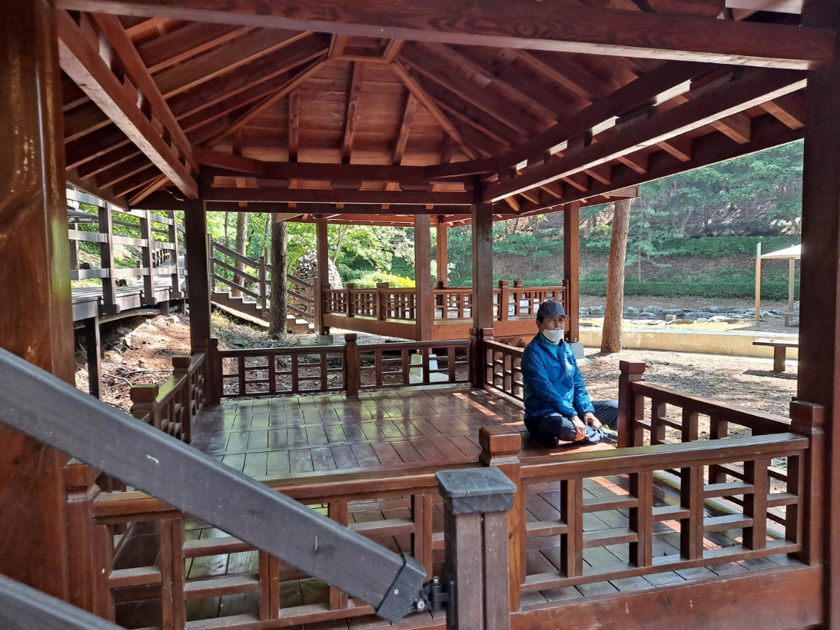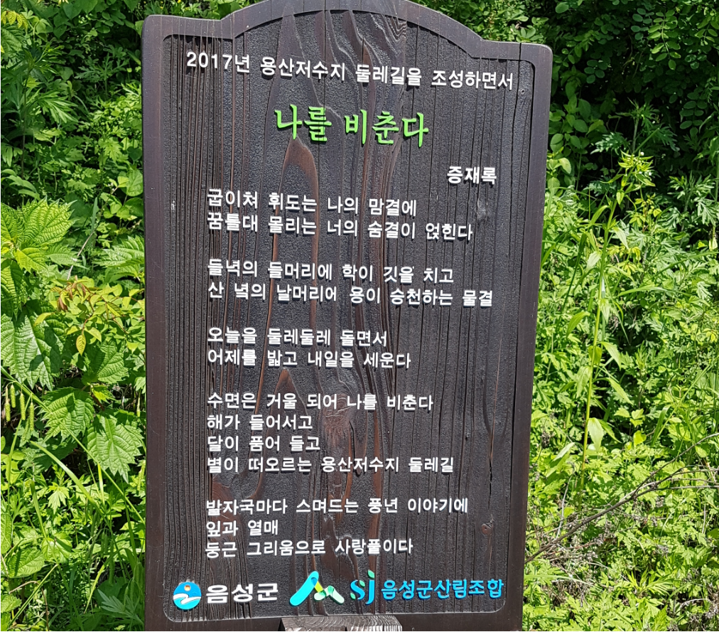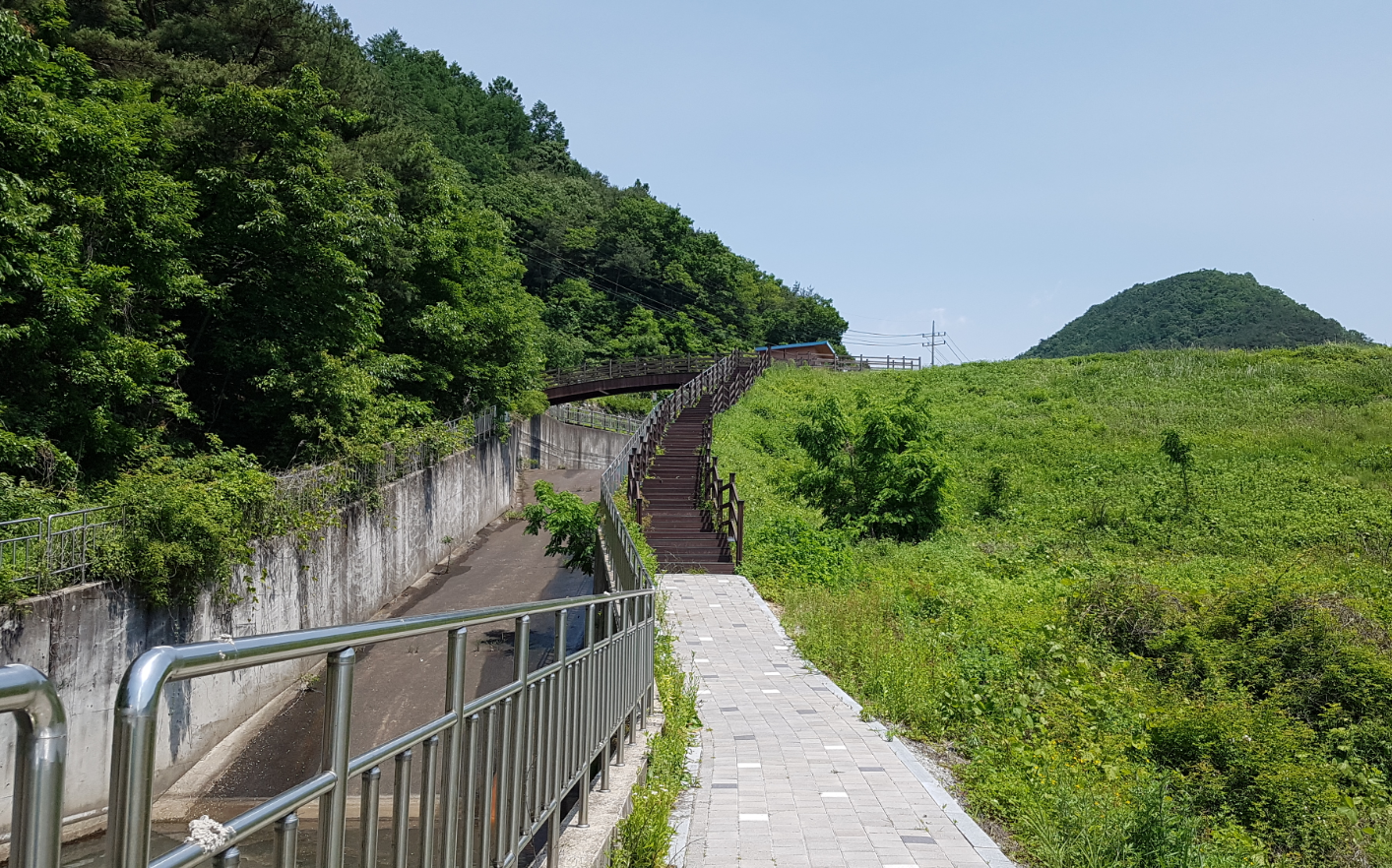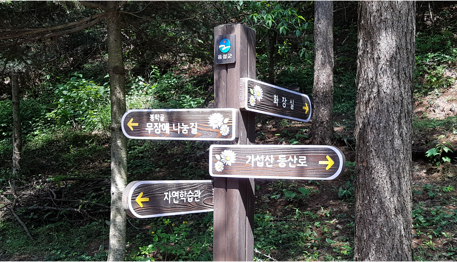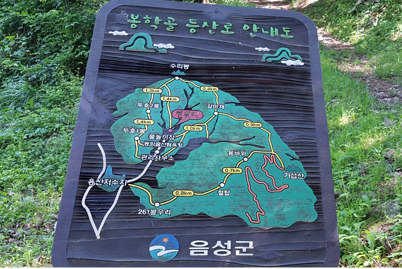 저수지 뒤로 솟아 있는 가섭산이 눈에 들어온다. 용산저수지를 한 바퀴 돌아 드는데 둘레길 거리가 2.09km에 불과해서 걷는 시간도 30분 남짓이다. 봉학골 앞 주차장=>화장실=>저수지=>제방=>주차장 원점복귀로 너무 짧다는 생각에, 저수지 상류쪽에 조성된 군립 봉학골 산림욕장으로 오른다.