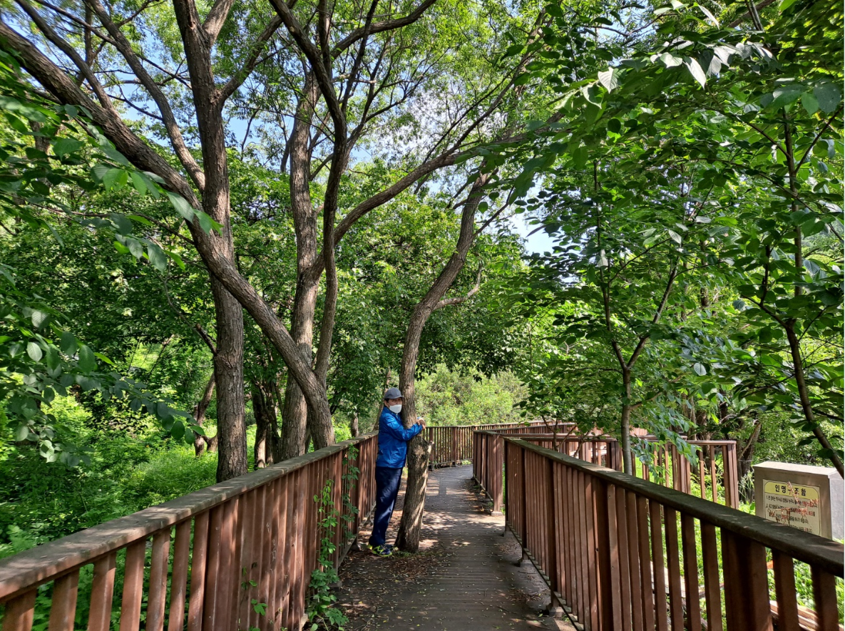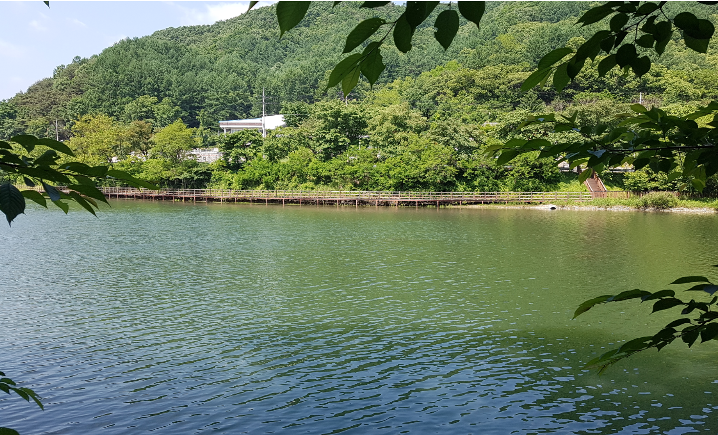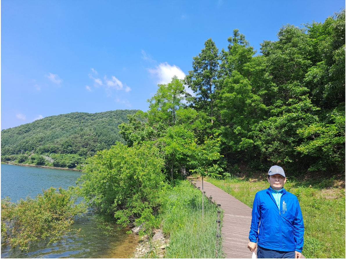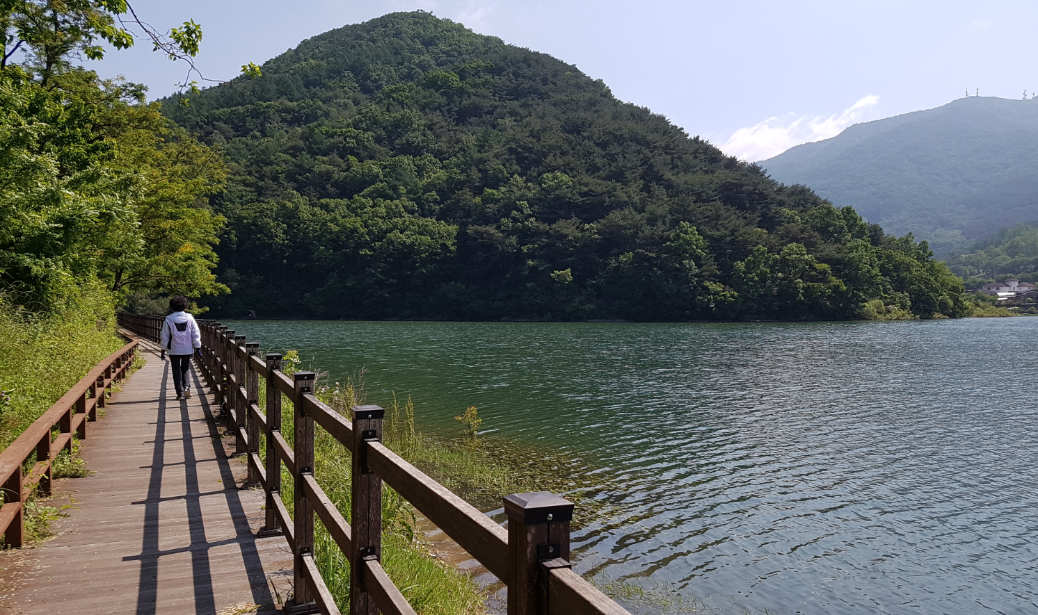 이곳 주차장은 봉학골 산림욕장 주차장이다. 넓은 주차장에도 주말이라서 그런지 많은 차들이 이미 주차 중이다. 이 둘레길은 원점회귀 코스라서 어느 쪽으로 돌아도 상관이 없다. 저수지를 따라 잘 설치된 데크길에 들어서는 것으로 본격적인 둘레길 걷기에 들어갔는데, 발걸음을 옮길 때마다 바뀌는 저수지의 풍경이 감탄사가 나올만큼 아름답다.