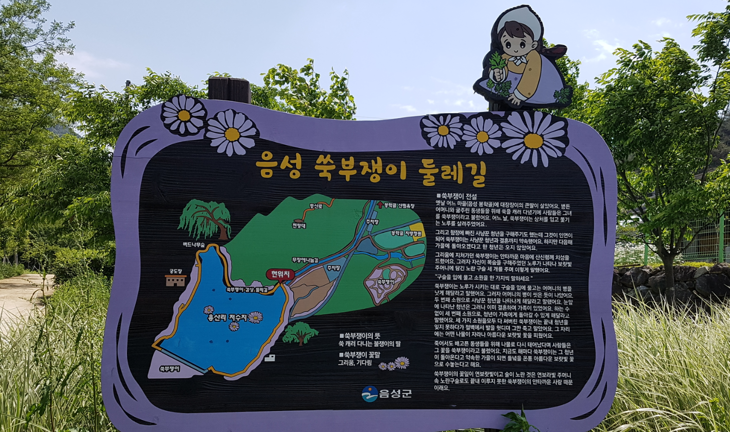 쑥부쟁이 둘레길(용산리 저수지)은 충북 음성군 부용산 남쪽에 위치하고 있으며, 상류쪽에는 군립 봉학골 산림공원이 있다. 저수지 옆으로는 음성궁도장과 다양한 위락 시설들이 들어서 있다. 용산저수지라고도 한다. 농업 용수 공급을 목적으로 1970년 1월 1일에 착공하여 1975년 11월 1일에 준공하였다.
