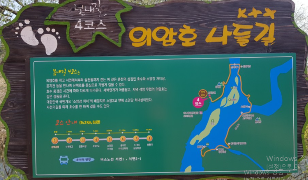 의암호 둘레길은 서면 문학공원에서 시작하여 눈늪나루, 둑길, 성재봉, 마을길, 오미나루(경찰충혼탑 앞), 신매대교, 호반산책로, 소양2교, 근화동 배터, 공지천, 어린이회관, 봉황대로 걷는 코스로 14.2km로 약 5시간정도 걸린다. 의암호를 끼고 서면에서부터 삼천동까지 걸으며 춘천의 상징인 호수와 소양강 처녀상, 공지천 등을 만나며 산책로를 중심으로 걸을 수 있다.