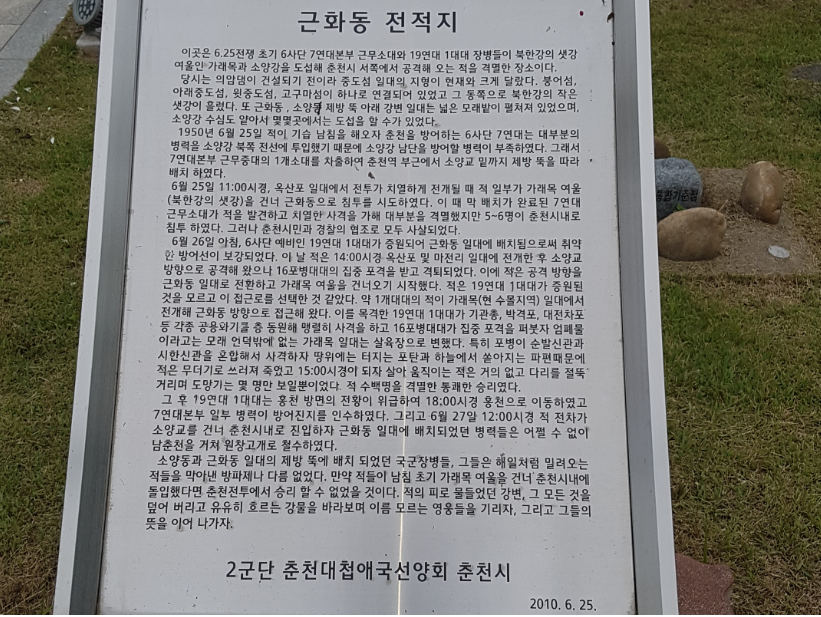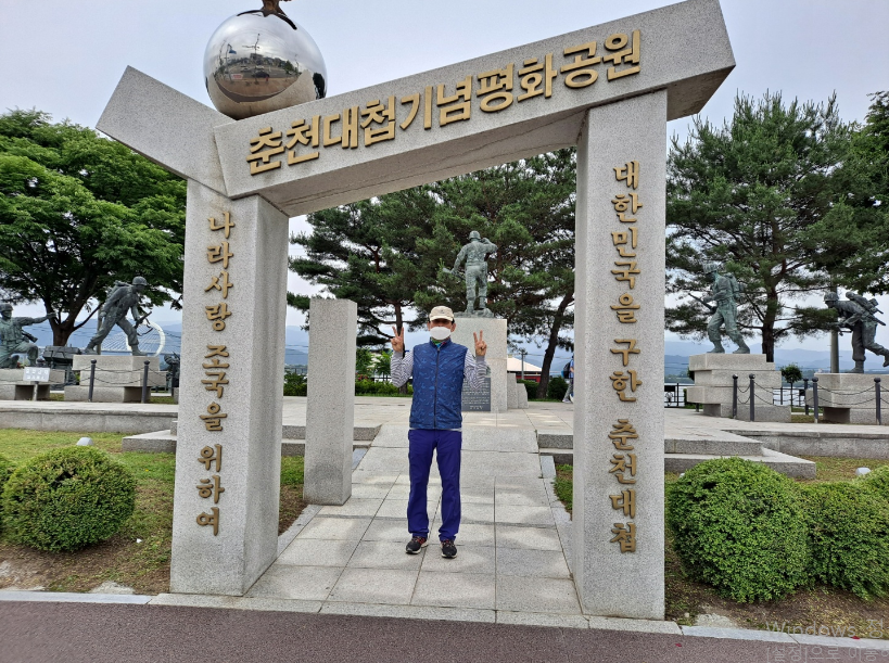 춘천역 옆에 있는 춘천대첩기념평화공원이다. 한국전쟁 시기 격전이 벌어졌던 이곳에는 나라를 위해 목숨을 바친 호국영령들을 기리는 무공탑과 육이오참전학도병기념탑, 기념 조각들이 줄지어 서 있다.
