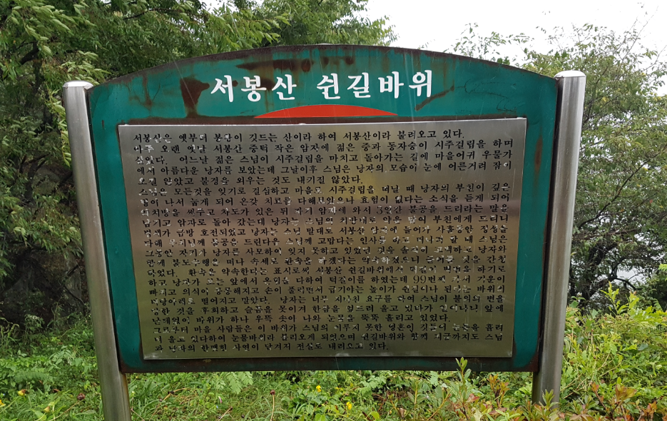 환속[還俗]을 약속한다는 표시로써 서봉산 쉰길바위에서 턱걸이 백번을 하기로 하고, 낭자가 보는 앞에서 온힘을 다하여 턱걸이를 하였는데 99번째 올라가서 기운이 빠지고 의식이 몽롱해지고 손이 풀리면서 급기야는 높이가 쉰길이나 된다는 바위의 벼랑아래로 떨어지고 말았다. 낭자는 너무 지나친 요구를 하여 스님이 불의의 변을 당한 것을 후회하고 슬픔을 못이겨 한참을 엎드려 울고 있다가 일어나니 앞에 난데없이 바위가 하나 우뚝 솟아 나와 눈물을 뚝뚝 흘리고 있었다. 그로부터 마을 사람들은 이 바위가 스님의 이루지 못한 영혼이 깃들어 눈물을 흘리며 울고 있다하여 눈물바위라 불리게 되었으며 쉰길바위와 함께 지금까지도 스님과 낭자의 한 맺힌 사연이 담겨 전설로 내려오고 있다.