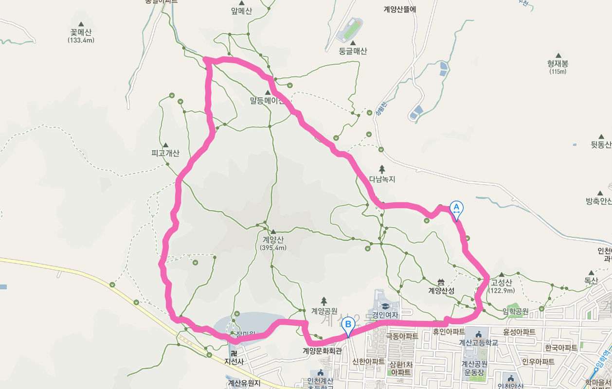 계양산(桂陽山)은 인천광역시 계양구에 있는 높이 395.4m의 산이다. 산의 이름은 고려 초기에는 수주악(樹州岳), 고려 의종 이후에는 안남산(安南山)으로 불리다가, 고려 고종 때 계양도호부가 설치된 후 현재의 계양산으로 불리게 되었다. 이 계양산둘레길 지도는 카카오맵에서 캪춰한 것이다.