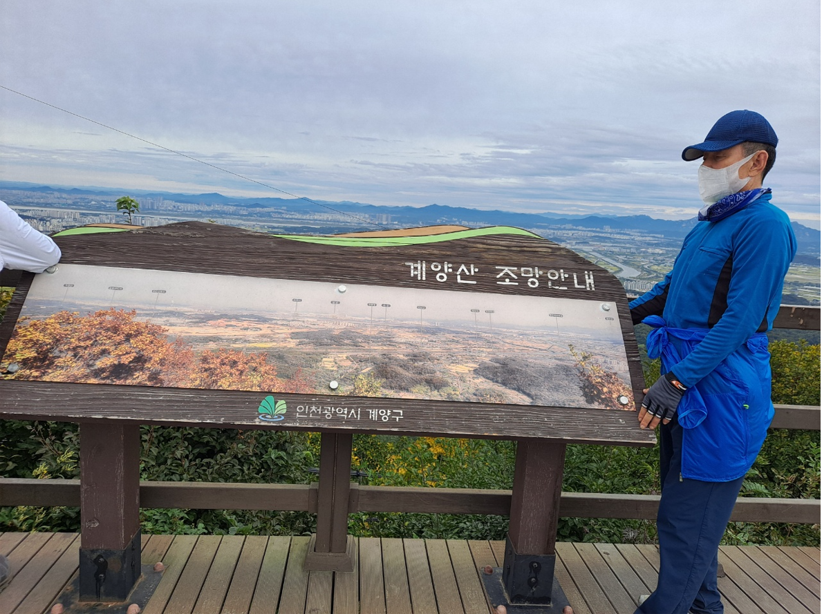 계양산은 해발 395m로 인천을 대표하는 진산(鎭山)이자 주산(主山)이다. 계양산 동쪽 기슭 봉우리에는 삼국시대에 축조된 계양산성(桂陽山城)이 있고, 서쪽으로는 조선 고종 20년(1883년)에 해안방비를 위해 부평고을 주민들이 참여하여 축조한 중심성(衆心城)이 징매이고개(景明峴) 능선을 따라 걸쳐 있었다. 여기 안내 표지목에는 또 '서해랑길' 이란다.
