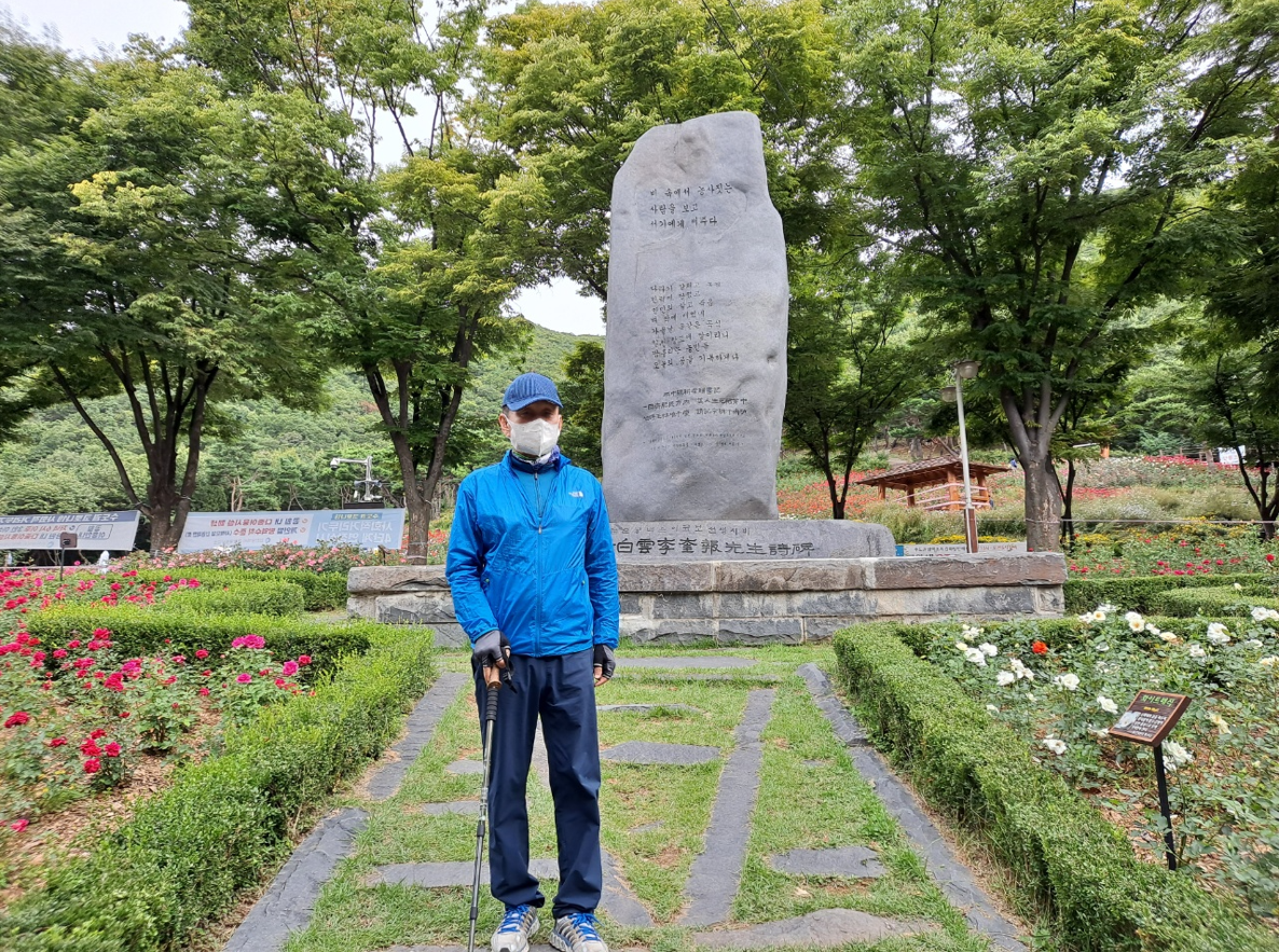 장미원에서 처음 만나는 백운 이규보선생 시비(詩碑)다. 이규보(李奎報)의 호는 백운거사(白雲居士)와 삼혹호 선생(三酷好先生)이다. 백운거사라는 호를 통해 그가 산촌에 한가롭게 은거하면서 인생을 달관한 멋스러운 일생을 보냈음을 짐작할 수 있다. 삼혹호 선생이라는 호는 세 가지를 몹시 좋아하여 붙여진 것으로서 그 세 가지란, 거문고와 술과 글을 일컫는다. 고려 시대의 시인이자 철학자이며 호탕하고 활달한 시풍(詩風)은 당대를 풍미했으며, 특히 벼슬에 임명될 때마다 그 감상을 읊은 즉흥시가 유명하다.
