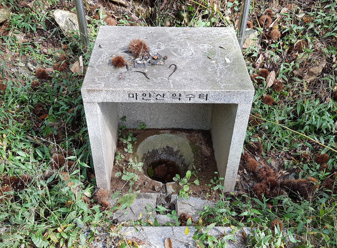 언젯적 만들어진 약수터인지 모르지만, 그리 오래되진 않았을 것 같은 자태임에도 떨어진 밤송이가 목욕탕의 욕조삼아 조용하게 홀로 앉아 있다.