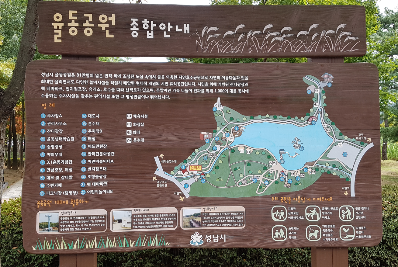 율동저수지의 분수, 높이 13m 인공암벽, 배드민턴장, 어린이 놀이터, 발 지압장, 잔디광장, 사계절 꽃동산, 갈대밭, 궁궁장 등의 다양한 시설을 갖추고 있어 계절에 관계없이 사람들이 많이 찾는다. 호수 주변으로 아늑한 카페들이 자리하고 있어 밤이면 데이트를 즐기는 연인들의 데이트코스로도 인기가 높다는데, 우린 점심 식사만 여기서 푸짐하게 했다.