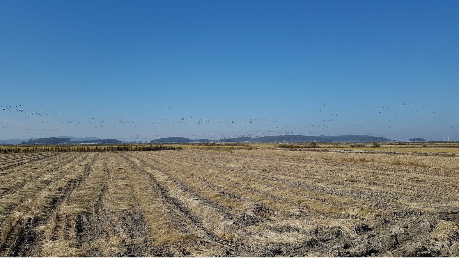 추수를 끝낸 논바닥위에 시커멓게 떼지어 내려앉은 기러기떼 들이 일제히 날아오르는 장관을 본다. 요즘엔 쉽사리 볼 수 잆는 정경이다. 끼욱~ 끼욱~ 울며 날으는 모습에서 까악~ 까악~ 울음의 까마귀떼가 아님을 알 수 있었다.