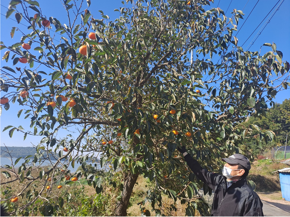 무르익은 가을 볕에 샛노랗게 영글어가는 감나무 열매가 탐스럽다.
