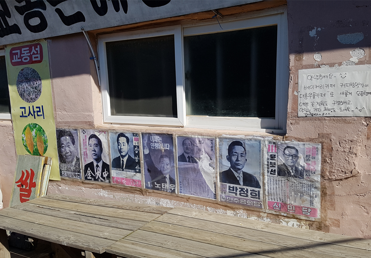 옛날의 선거벽보가 붙어있는 담벼락에 전직 대통령들의 모습이다. 이승만 대통령 모습만 안보이는 포스터를 보면서 요즘 대선으로 들뜬 우리네 현실을 보는 듯 새삼스레 지나온 세월을 거스르며 추억하게 한다.