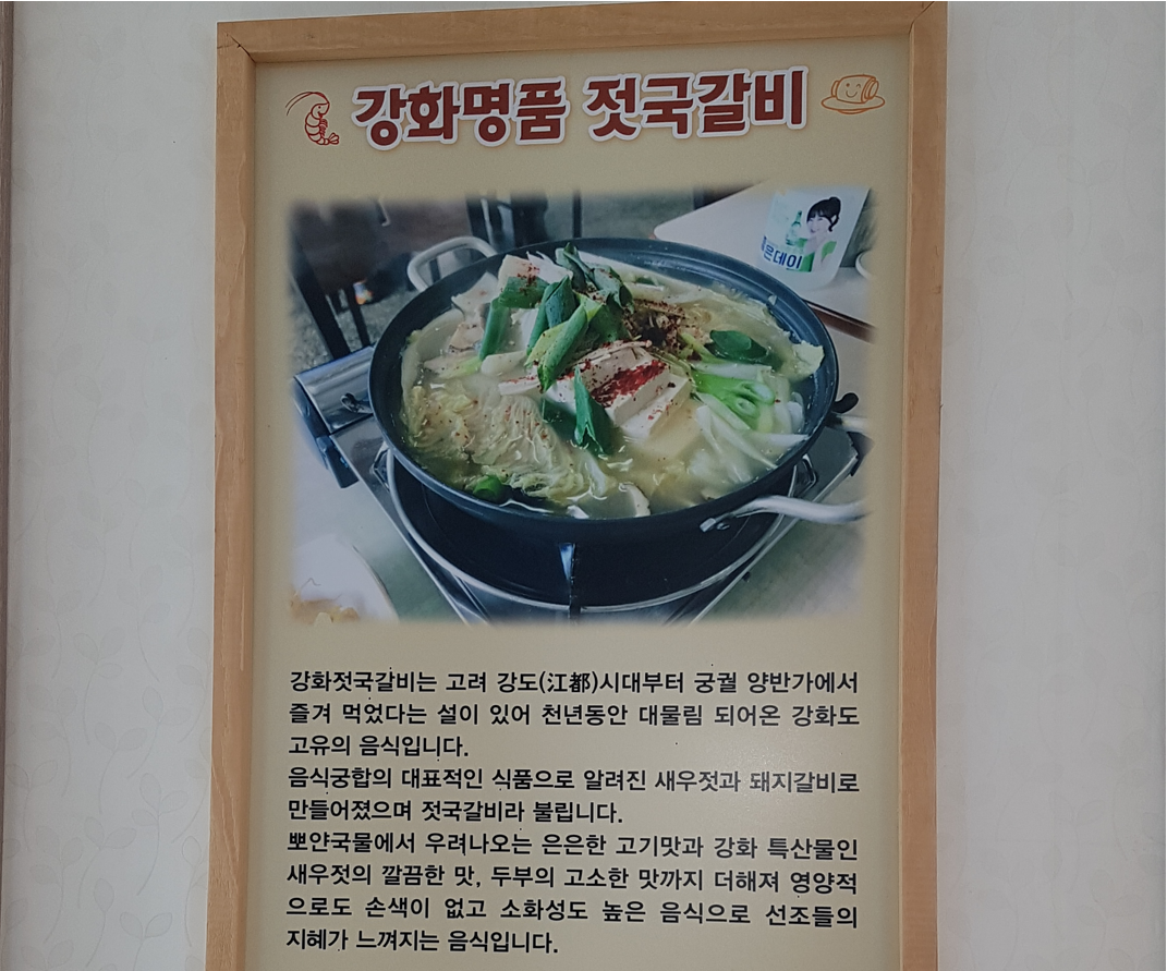 젓국갈비는 강화도의 향토 음식이다. 갈비에 새우젓을 넣어서 끓여낸 음식이며 주로 강화도 지역에서 먹는다. 갈비에 새우젓의 젓국물을 넣어서 끓여낸 강화도 향토음식으로 돼지갈비와 돼지뼈에 채소와 새우젓의 젓국물을 넣고 끓여낸다. 유일하게 강화도 지역에서 먹을 수 있는 음식으로 소금으로 간을 하는 대신 새우젓을 간을 하여 맛을 내는 것이 특징이다.