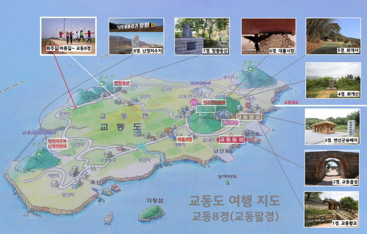 아름다운 섬 교동도의 교동8경은 교동향교, 교동읍성, 연산군유배지, 화개산, 화개사, 대룡시장, 망향동산, 난정저수지로 고구저수지는 그냥 낚시터로만 표시되고 8경에서는 제외되어 있다.