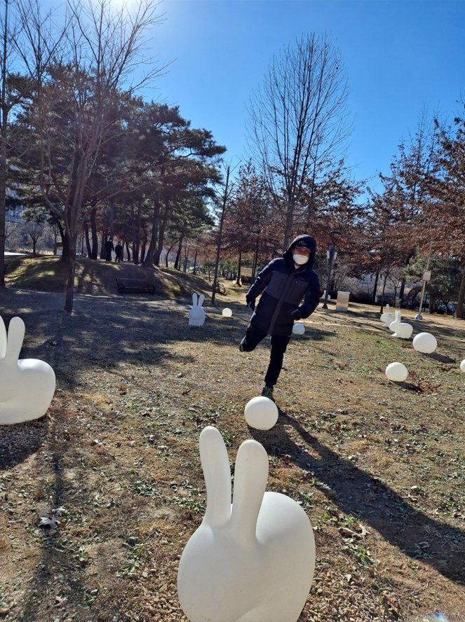 공원의 곳곳에 전시된 시(詩)작품이나, 혹은 조각작품이나, 설치미술인듯 꾸며놓은 이 작품도 역시 너무 재밋게 전시되어 있어서, 장난스레 축구공으로 여기는 포즈로 사진을 찍어보기도 했다.