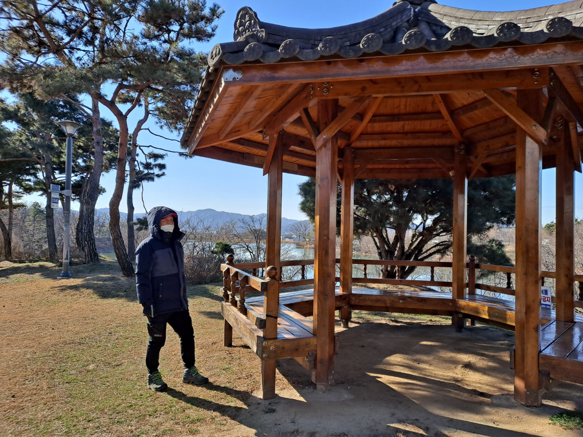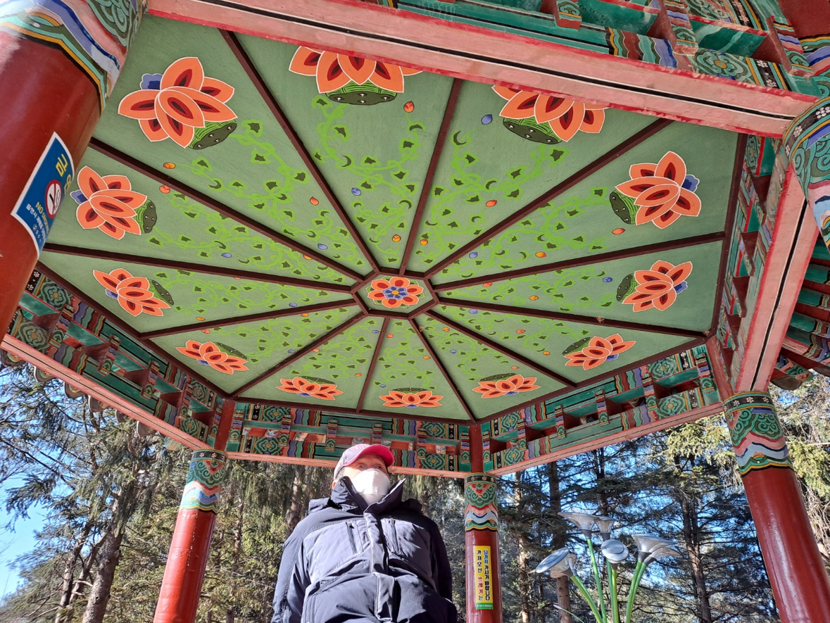 산책로 주변에 일정한 거리를 두고 중간 중간 지점마다 조깅이나 걷기를 즐기는 사람들을 위하여 쉼터로 만들어 놓은 6각형 정자에 그려놓은 문양이 흡사 전통미술관에 찾아온 듯 착각을 일으킬만큼 정말 멋진 예술품이다.