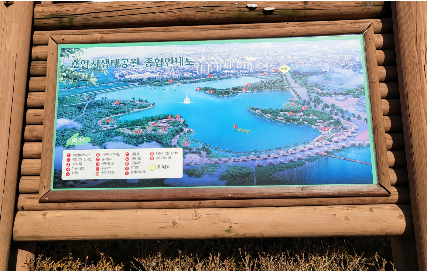사원정(獅苑亭)이다. 이곳 호수의 한적한 분위기와 잘 어울리는 육각정이다. 이 정자의 안쪽에는 호암지의 주요 기념시설들을 가지런히 소개하여 놓았다. 쉬면서도 그냥 멍때리며 쉬는게 아니라 역사와 지역문화를 공부하면서 쉬라는 뜻이라고 여겨진다. ㅎㅎ