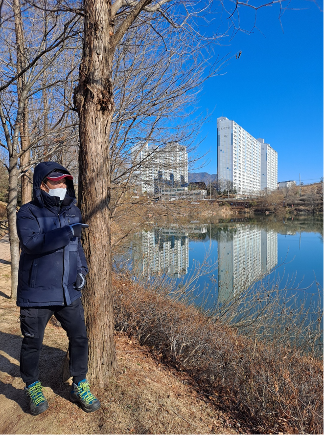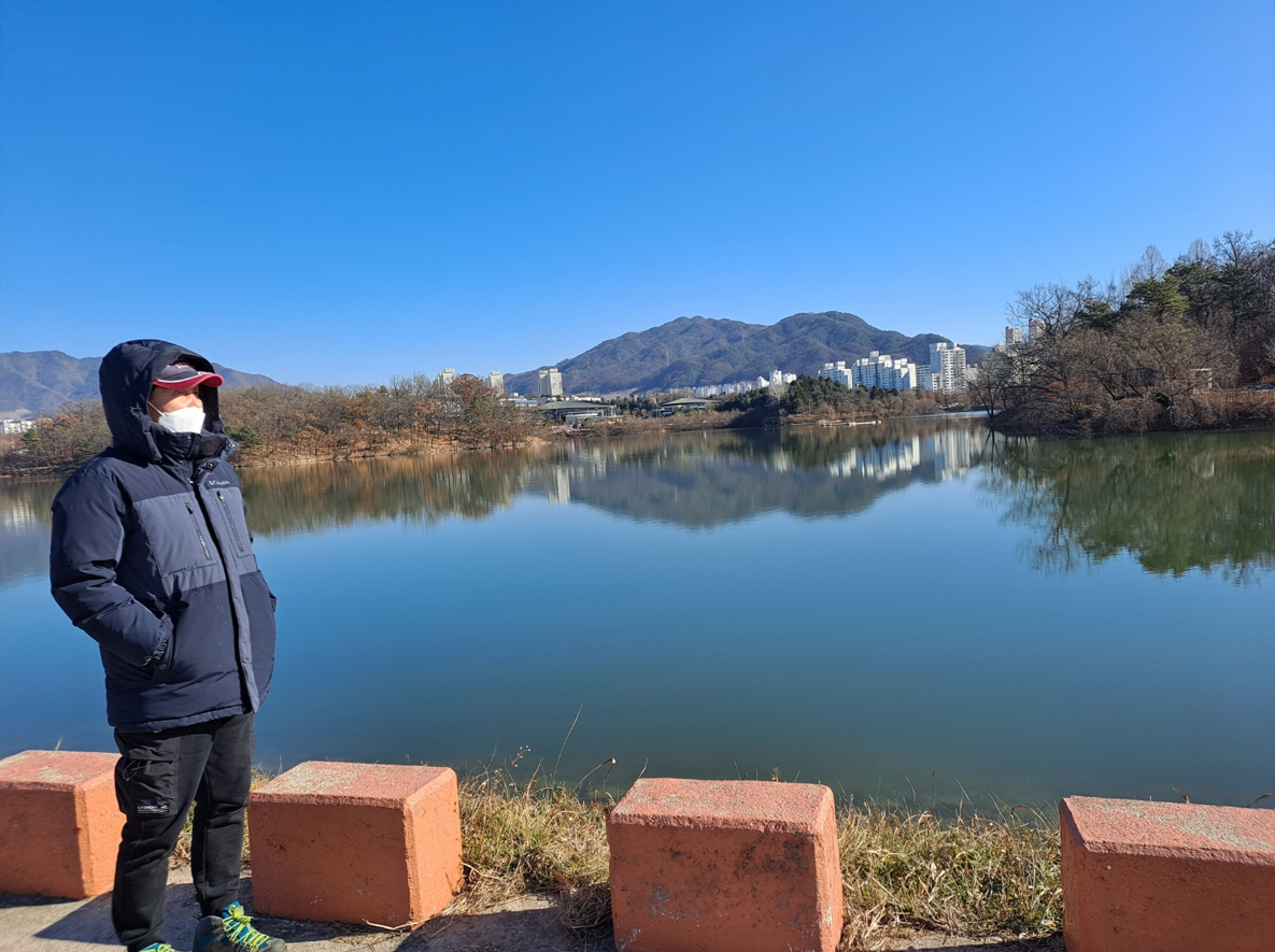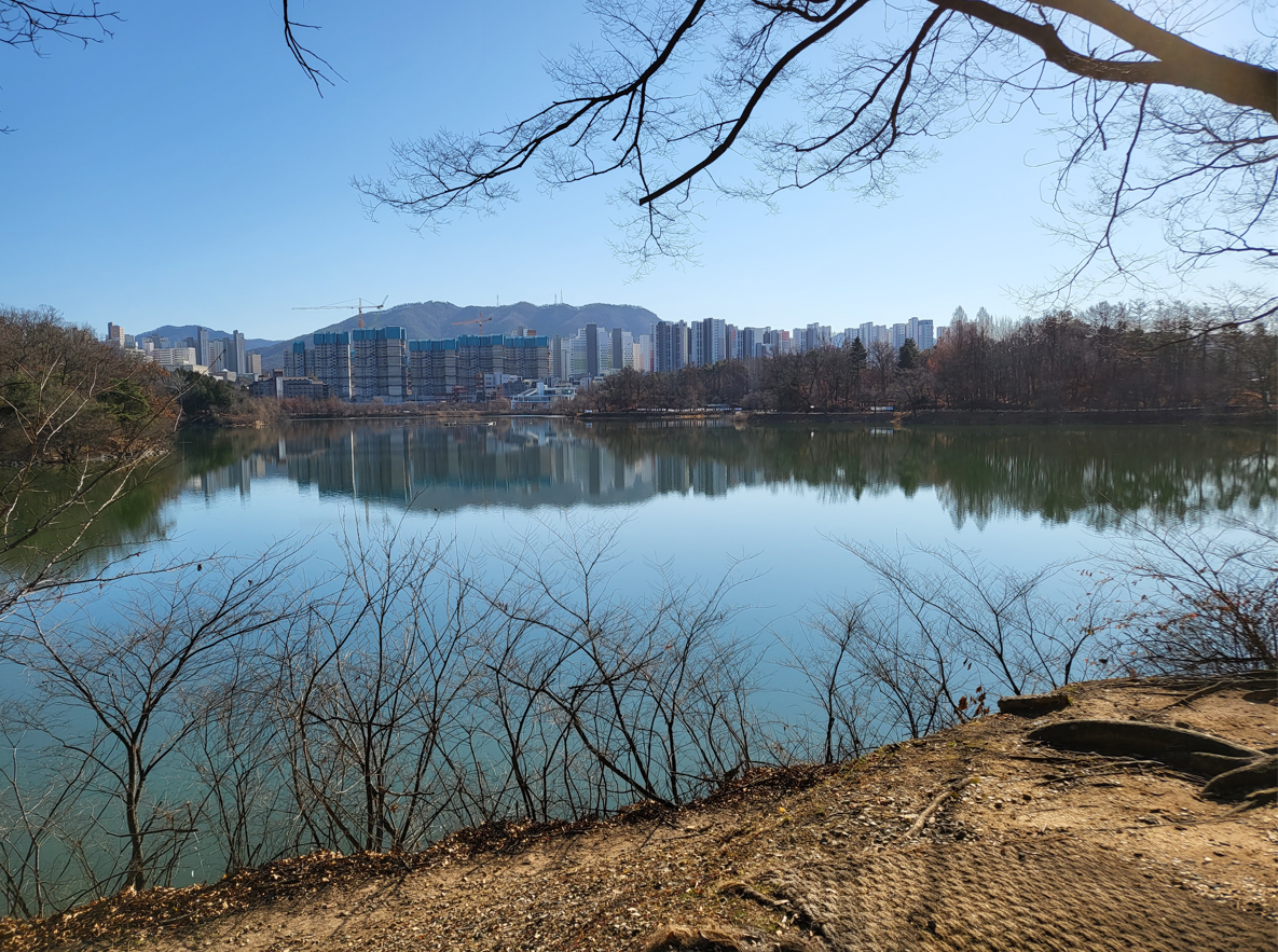 호수의 물빛에 그대로 투영된 아파트의 그림자가 흡사 물속에 지어 놓은 쌍둥이 아파트인 것 같다. 어쩜 이렇게 투명할 수 있을까? 하늘빛마져 영롱한 모습 그대로 투영되었다. 마냥 신비롭다.