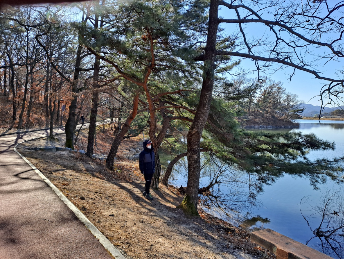 호암지를 걷다보면 소나무가 많다. 이렇게 호숫가에 소나무가 많은 풍경은 쉽게 접하기 어려운 곳이다. 피톤치드가를 가득 내뿜는 소나무 숲에서 힐링할 수 있으니 얼마나 좋은가?