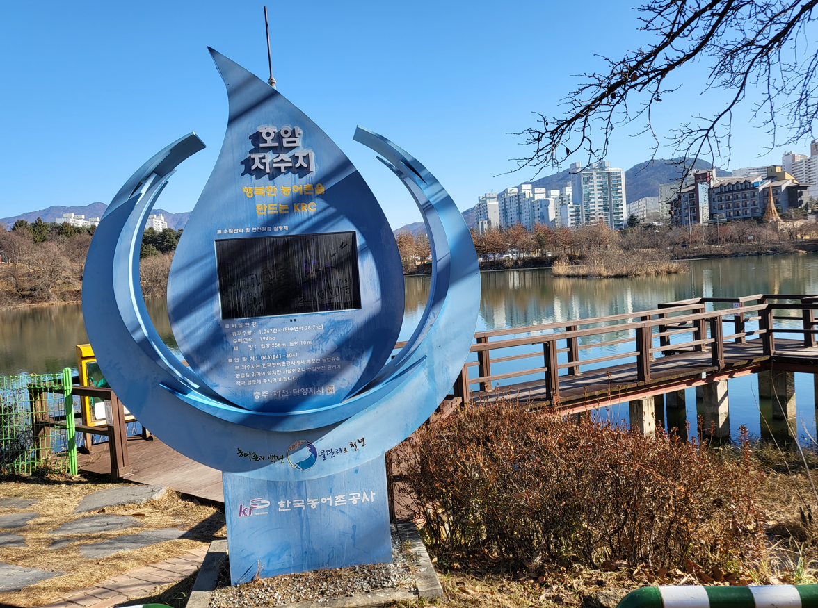한국농어촌공사에서 관리하는 이곳은 충주시 사직산 서쪽에 위치한 호암저수지로 과거부터 연꽃이 만발하여 연지(蓮池)고도 불렸단다. 호수둘레는 약 4km, 조깅코스(둘레길 걷기코스)는 약 2.7km이다. 호암지는 인공저수지로써 저수량 1,030천톤, 호수면적 254ha, 제방높이 10m, 제방길이 255m의 저수지다. 충주분지의 중심을 이루는 모시래들(일명 달천평야 또는 충주평야)의 젖줄이었지만 지금은 농업용수보다는 유원지로서의 역할이 더욱 크다.