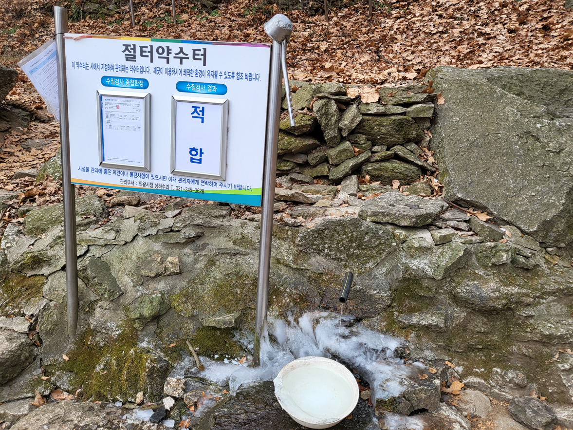 절터약수터이다. 우뚝한 바위 절벽 아래 몇 곳의 자그마한 평탄지가 있다. 석축도 남아있고 무수히 많은 기와편도 밟힌다. 경일암(擎日庵)터다. 절의 연혁은 정확히 알 수 없으나 임영대군의 원찰이었을 것으로 생각되는데 한국전쟁 이전까지 존속했으니 500년 도량(道場)이 빈터로 남은 것이다. 지금도 두 개의 샘이 마르지 않고 이렇게 약수터로 흐른다.