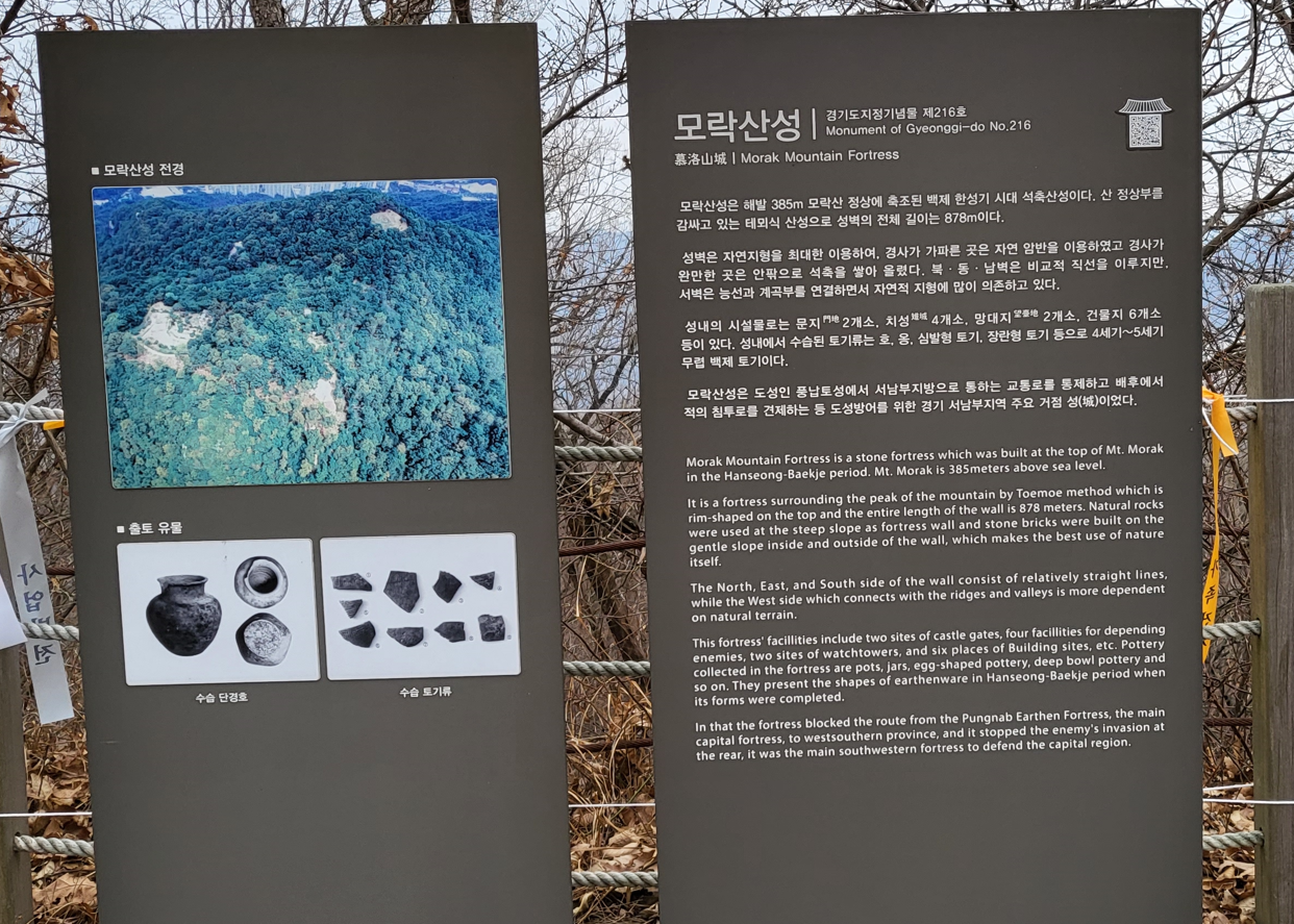 모락산성은 해발 385m 모락산 정상에 축조된 백제 한성기 시대 석축산성이다. 산 정상부를 감싸고 있는 태뫼식 산성으로 성벽의 길이는 878m이다. 성벽은 자연·지형을 최대한 이용하여, 경사가 가파른 곳은 자연암반을 이용하였고 경사가 완만한 곳은 안팎으로 석축을 쌓아 올렸다. 북·동·남벽은 비교적 직선을 이루지만, 서벽은 능선과 계곡부를 연결하면서 자연적 지형에 많이 의존하고 있다. 성내의 시설물로는 문지 2개소, 치성 4개소, 망대지 2개소, 건물지 6개소 등이 있다. 성내에서 수습된 토기류는 호, 옹, 심발형 토기, 장란형 토기 등으로 4세기~5세기 무렵 백제 토기이다. 모락산성은 도성인 풍납토성에서 서남부지방으로 통하는 교통로를 통제하고 배후에서 적의 침투로를 견제하는 등 도성방어를 위한 경기 서남부지역 주요 거점 성이었다.