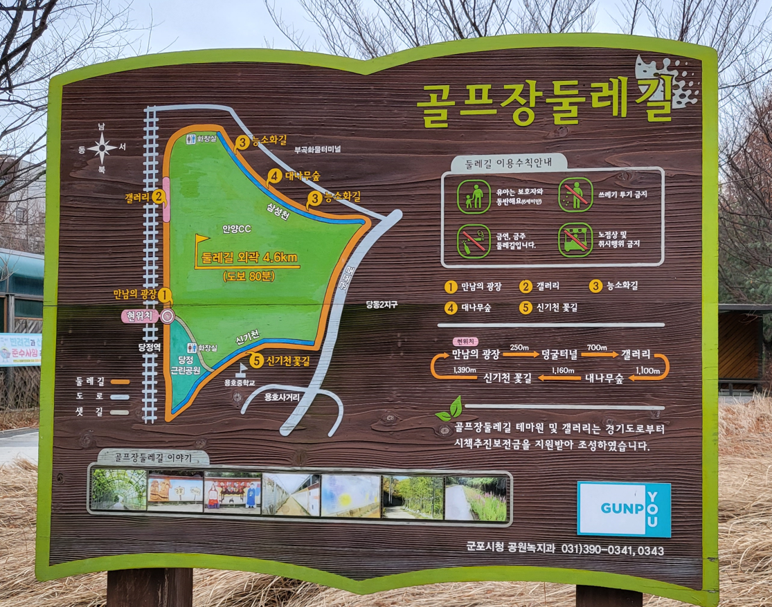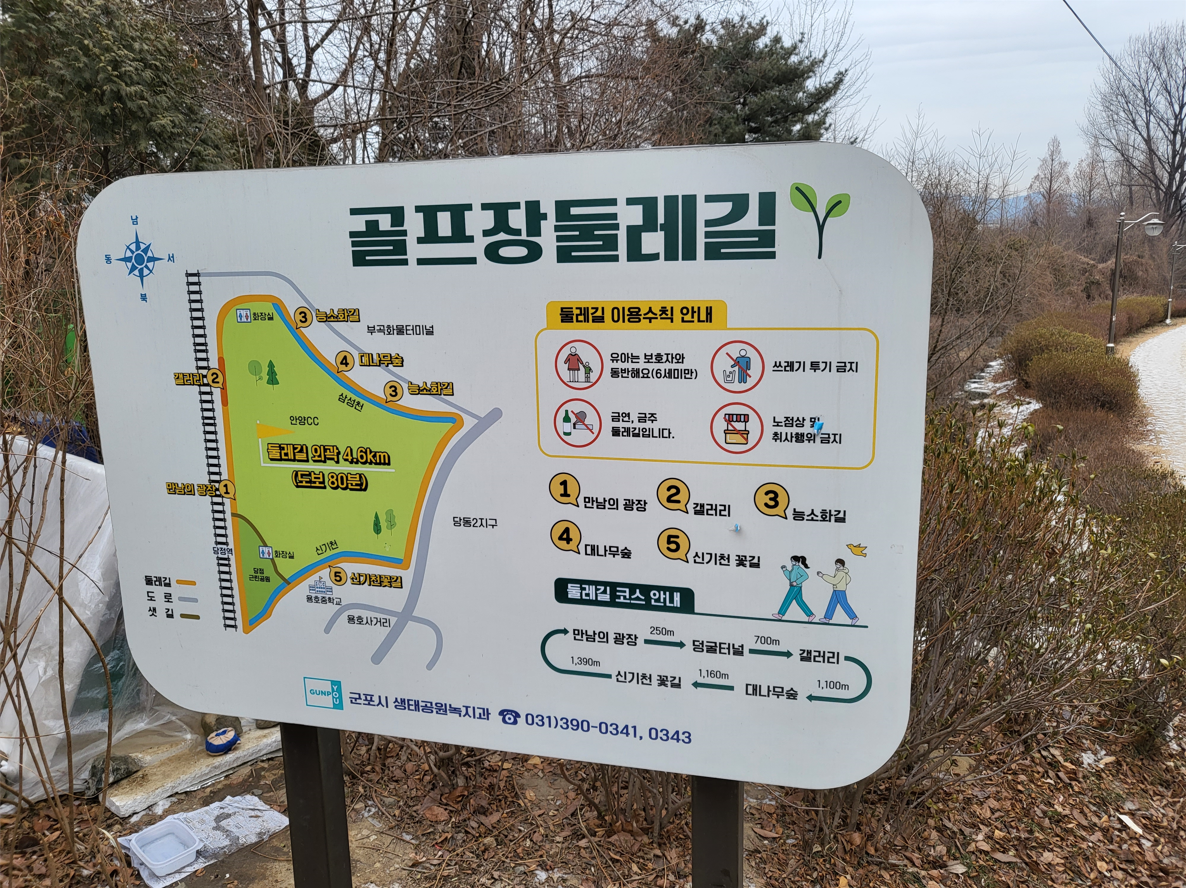 군포시가 지역의 새로운 걷기 명소로 지정·관리 중인 도심 속의 풍경 좋은 길 ‘골프장둘레길’은 안양컨트리클럽을 가운데 두고 당정근린공원(전철 1호선 당정역 앞)에서 시작해서 철도변, 삼성천 구간, 47번 국도길, 신기천 꽃길을 거쳐 다시 당정근린공원으로 돌아오는 약4.6㎞의 군포시민 휴식공간인 아기자기한 산책길이다.