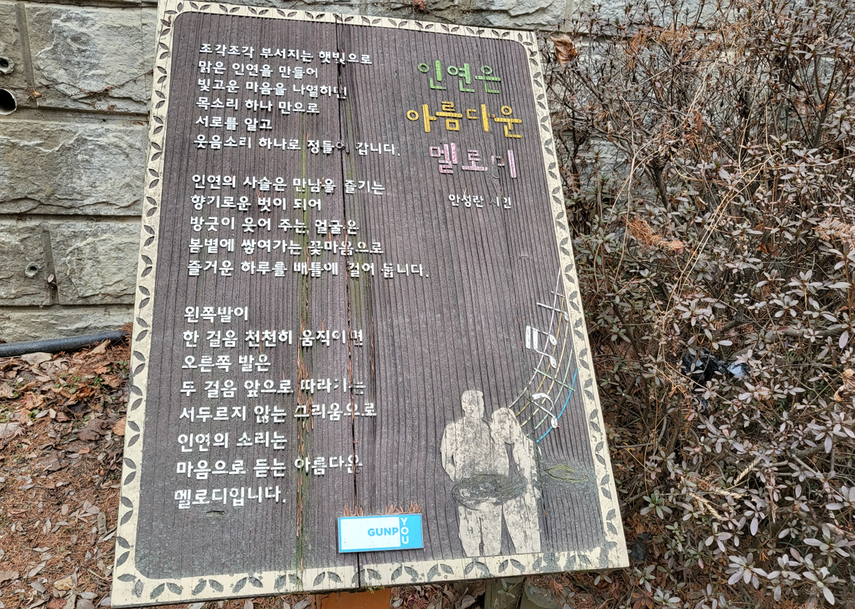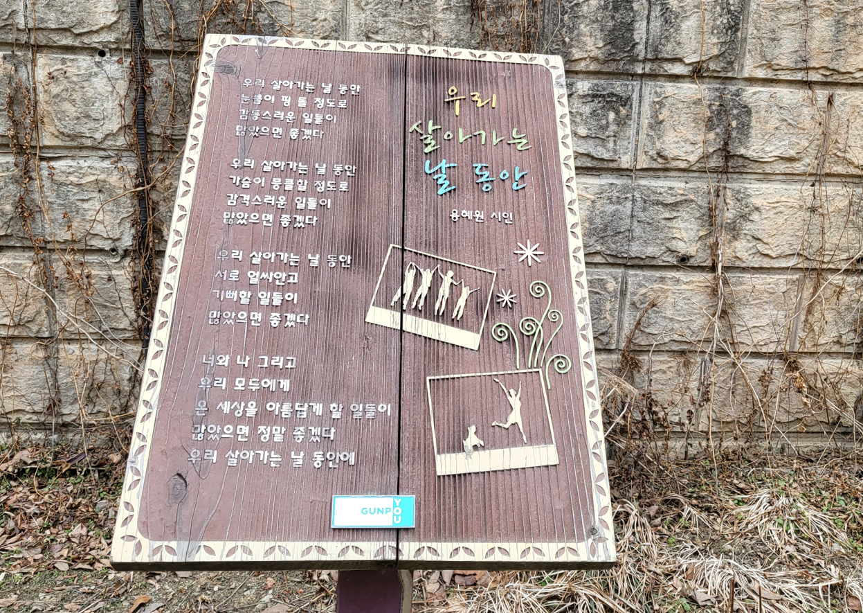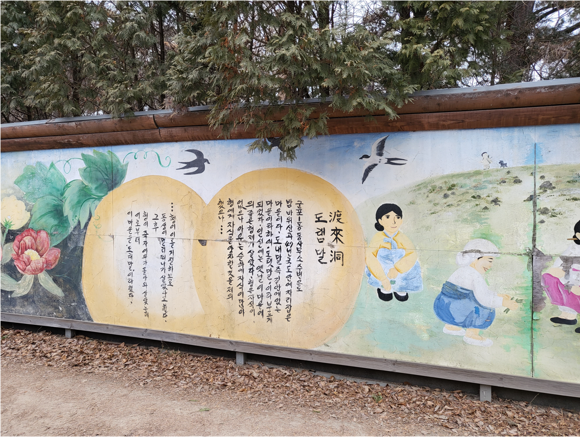 군표의 옛이야기. 수백년 이어온 삶의 이야기가 오롯이 담긴 둘레길. 군포시가 지역의 새로운 걷기 명소로 지정·관리 중인 도심 속의 풍경 좋은 길, ‘골프장 둘레길’을 더욱 아름답게 꾸미기 위해 갤러리 등을 이렇게 멋지게 만들었단다.