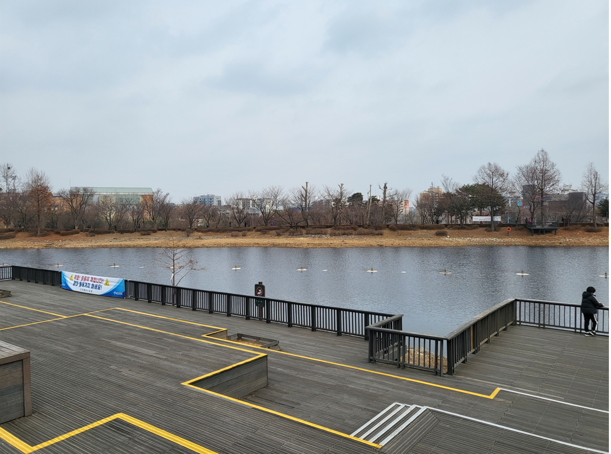 호수는 생각보다는 조금 크다. 비록 석촌호수나 일산의 호수공원의 규모는 아닐지라도 아담한 연못의 수준을 넘어선다. 서편 물가로는 문화데크 광장을 조성했고, 광장에는 메타세쿼이아와 미루나무를 여러 그루 심었다. 두 수종은 나무들 가운데 키가 큰 편이다. 자연스레 호수에 그림자가 어리는데 그것이 또한 볼거리다. 광장 인근의 야구장 조명탑도 한데 어울려 물 위에 가지런하다. 호수를 둘러서는 걷기 좋은 산책로를 조성했다. 천천히 걸으며 건강하게 사색할 수 있다.