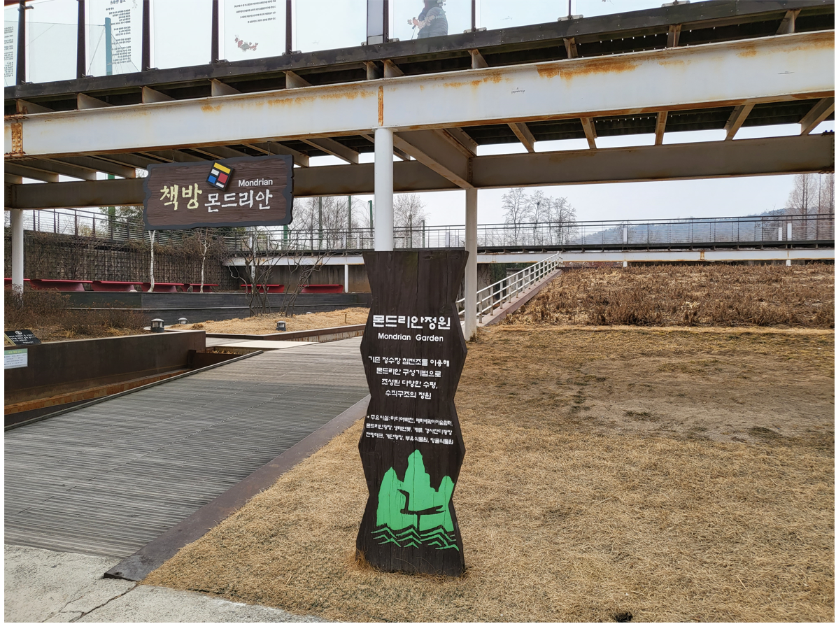 추상화가 몬드리안의 구성기법을 도입한 수직, 수평의 선이 조화를 이루는 정원으로 옛 정수장의 침전조를 부분적으로 존치하여 과거의 기억과 장소성을 부여하고 현재와 만나 자연스레 융화되도록 한 공간이다. 몬드리안 정원은 기존 신월정수장의 침전조를 재활용했다. 기존의 콘크리트 벽과 기둥이 골격을 이룬다. 지붕이 없으므로 하늘빛을 그냥 품는다. 그 공간의 너른 여백을 활용해 정원의 성격을 부여했고, 너른 공간에 독서를 할 수 있도록 공간을 갖춰 책방몬드리안이란다.