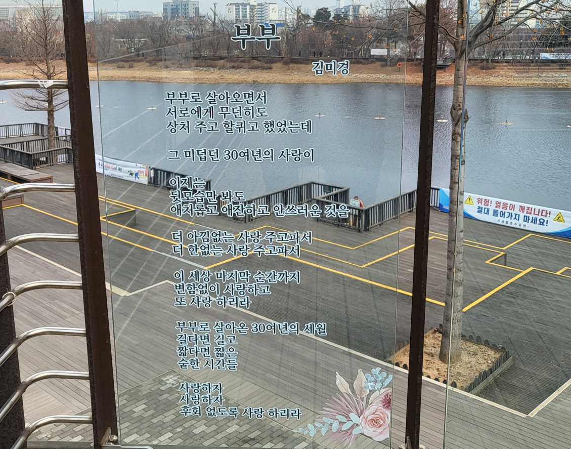 유리로 된 투명한 난간벽에는 이곳 출신 시인들의 아름다운 마음들이 글과 그림으로 기록되어 있다. 예술작품은 이곳을 찾은 산책객들의 마음을 호수와 함께 어루만져 주면서, 우리네 잔잔하고 포근한 삶을 아름다운 모습으로 나타내려 애쓴 흔적이 되었나 보다.