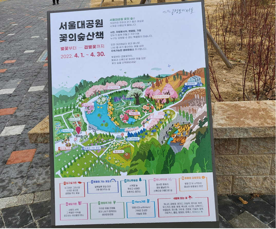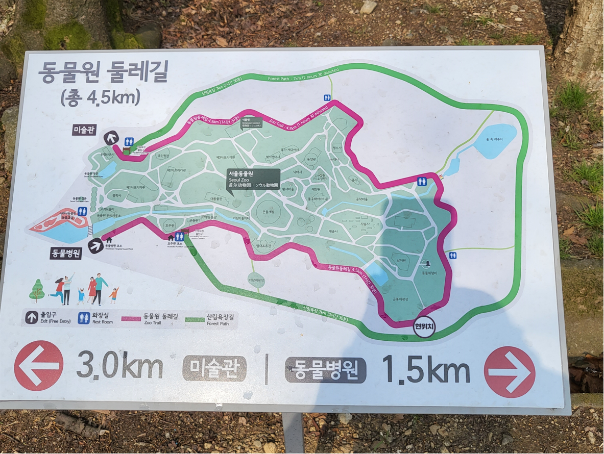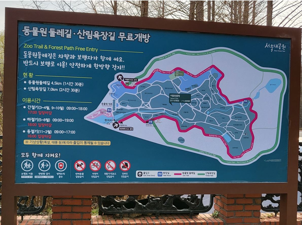 경기도 과천시 대공원광장로 102의 청계산 기슭에 위치한 종합 테마파크로 집에서 아주 가까운 곳, 서울대공원 안에 있는 동물원 둘레길 코스 4.5km를 한바퀴 돌아 싱그러운 봄기운을 만끽했다.