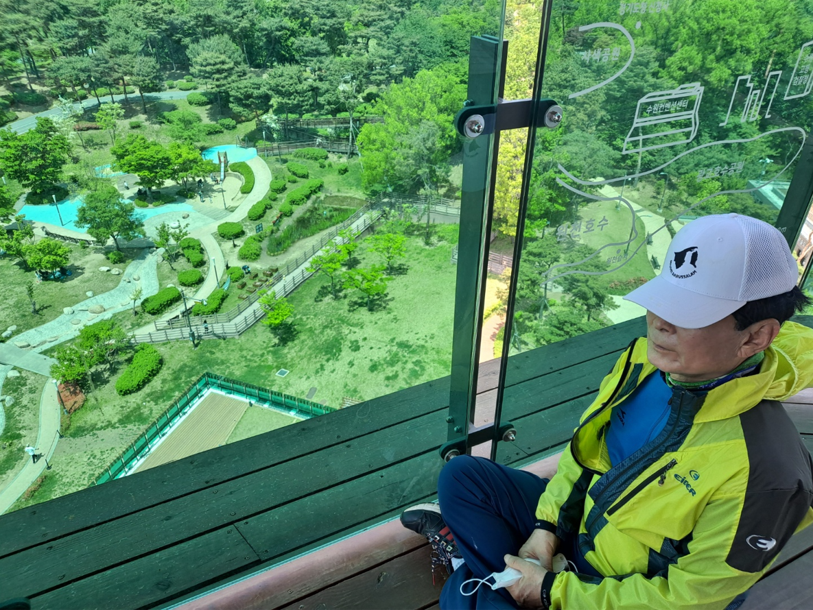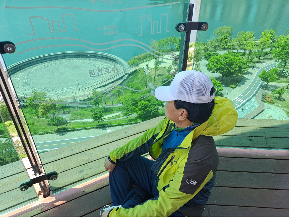 4층 높이의 전망대 엘리베이터를 타고 올라가니 광교호수공원이 한눈에 펼쳐졌다. 녹색의 봄을 맞은 환상적인 풍경이었다. 날씨가 맑아 광교호수의 수려함이 한눈에 들어왔다. 수도권에서 이만한 경관을 찾아보기 어려울 정도로 흠뻑 젖어든 매력이었다. 계단을 타고 빠른 걸음으로 올라와 숨이 조금 찼지만 전망대에 들어서니 가슴이 탁 트이는 느낌이었다. 공간도 넓고 조용하기도 하고 주변 환경이 연초록으로 펼쳐진 곳이라서 가슴이 타악 트이는 최고의 느낌이었다.
