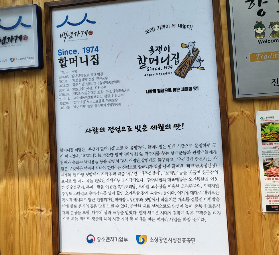 동화속에 나오는 꿈속의 아기자기한 집이다. 욕쟁이 할머니집은 제7회 충청북도 향토음식 경연대회에서 오리목살참숯불구이로 은상을 수상하는 등 40년 가까이 세월의 손맛과 정을 이어 가고 있다. 2003년에는 진천군에서 향토맛집으로 선정되었다. 현재 할머니집의 사장은 2대째 요리 비법을 전수받아 음식점을 운영하고 있는 큰며느리이다. 향토맛집 현판을 걸게 되면서 입소문을 타고 많은 사람들이 찾고 있다.