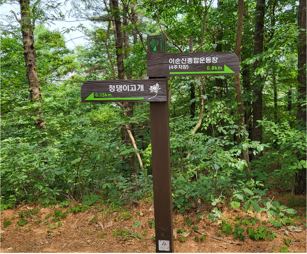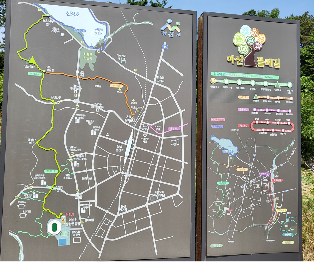 청댕이 둘레길은 충남 아산시 이순신 종합운동장 주차장에서 시작하여 청댕이고개 -> 매봉산 입구 -> 남산 입구 -> 남산갈림길 -> 남산 정상 -> 신정호 느티나무 쉼터까지 총 5.61Km를 걷는 아늑하고 시원한 숲길로 약 4시간 코스이다.