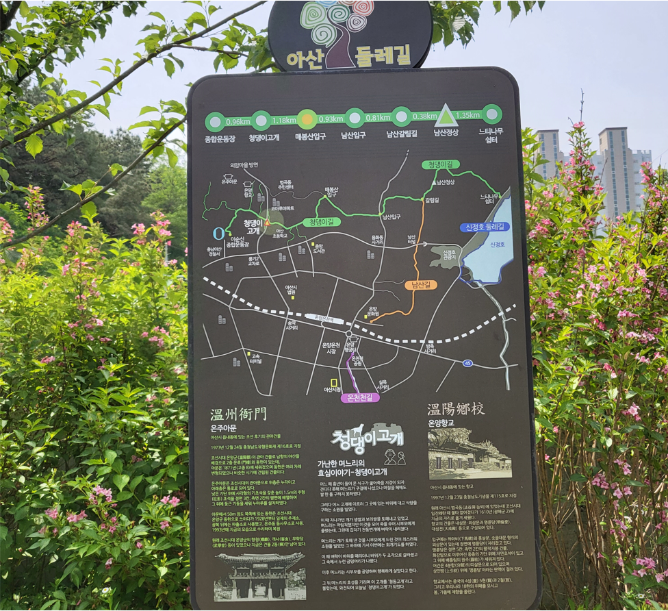 ‘온주’는 온양의 옛날식 표현으로 음식 특화거리인 온주맛고을 ~ 온양향교 ~ 온주아문 ~ 이순신종합운동장으로 숲길과 마을이 조화롭게 어우러진 순환형 둘레길로 아산의 역사를 이해하는데 좋은 길이다.