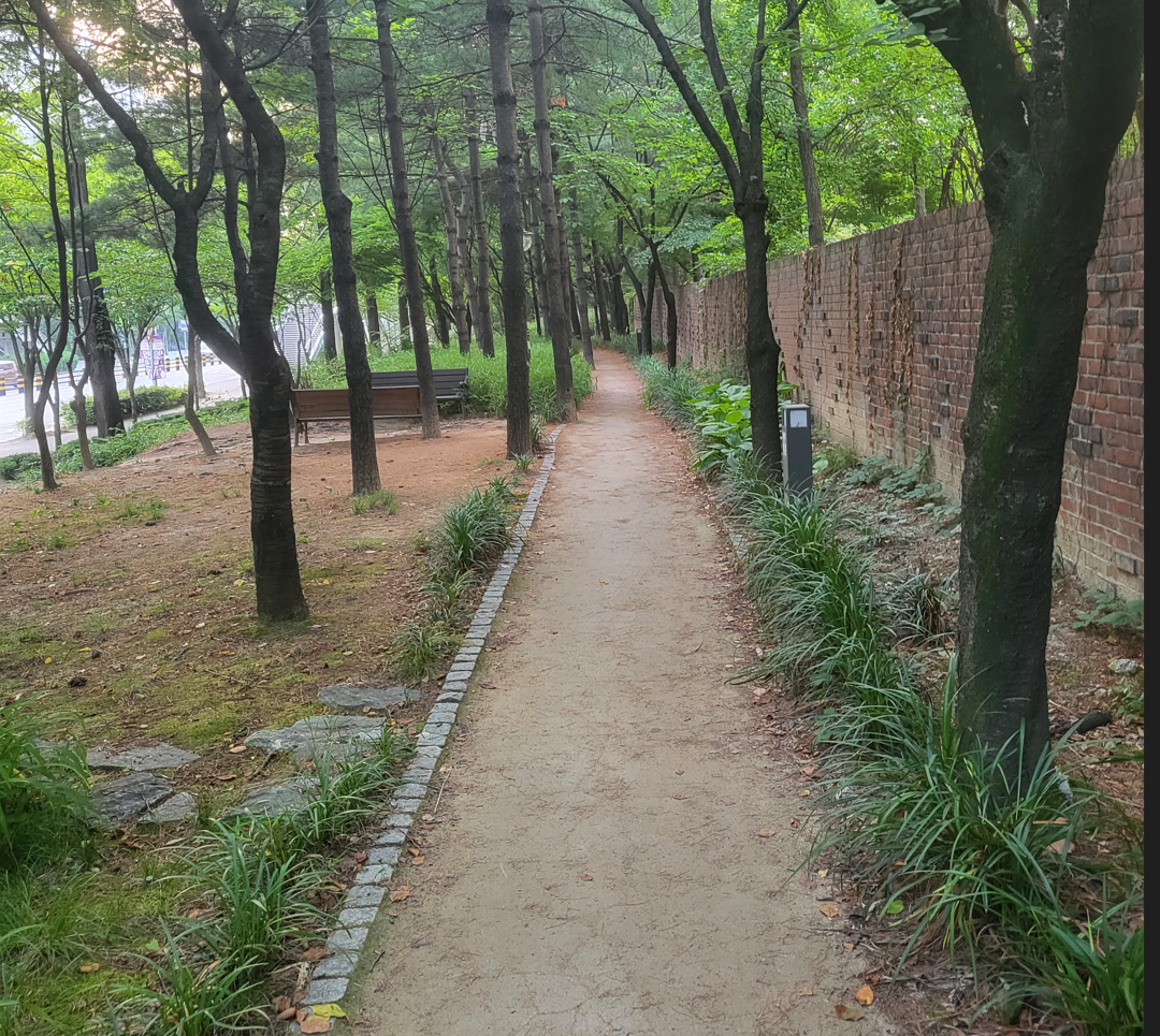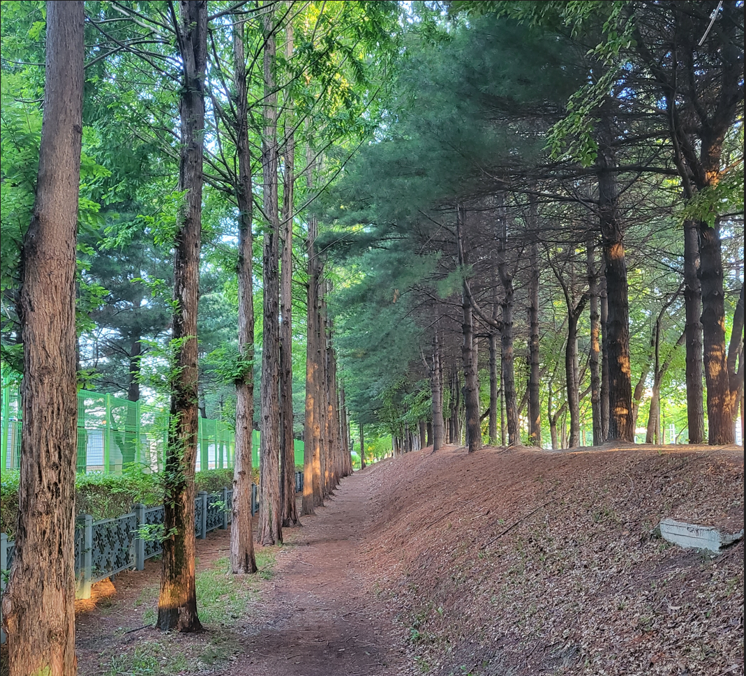 한여름의 땡볕에도 그늘을 만들어 줘서 걷기에 아주 좋고, 나무들이 촘촘하게 늘어선 잣나무 사잇길이라서 바람을 동반한 장마철의 빗길에도 안전하게 걸을 수 있어 너무 좋다.