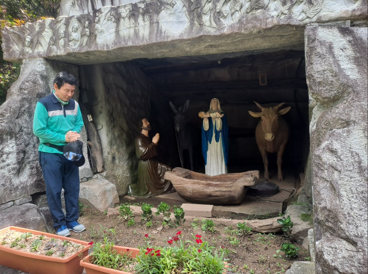 말구유에서 태어나신 예수의 조형물 앞에서 기도한다. 예수는 구유에서 출생했다는 이야기는 오로지 누가복음서에만 기록되어 있는데, 베들레헴의 그리스도는 그가 태어나게 된 이유를 누가는 인구조사 때문에 예수의 가족이 고향 갈릴리 지방의 나사렛이라는 마을을 떠나 팔레스타인의 남쪽 지방인 유다의 에루살렘 가까이에 있는 베들레헴으로 갔다고 말하고 있다. 그 이유는 나사렛요셉과 예수의 어머니 성모마리아가 다윗왕의 후손이기 때문에 다윗 왕의 고향인베들레헴에서 주민등록을 하기 위해서였다고 한다.